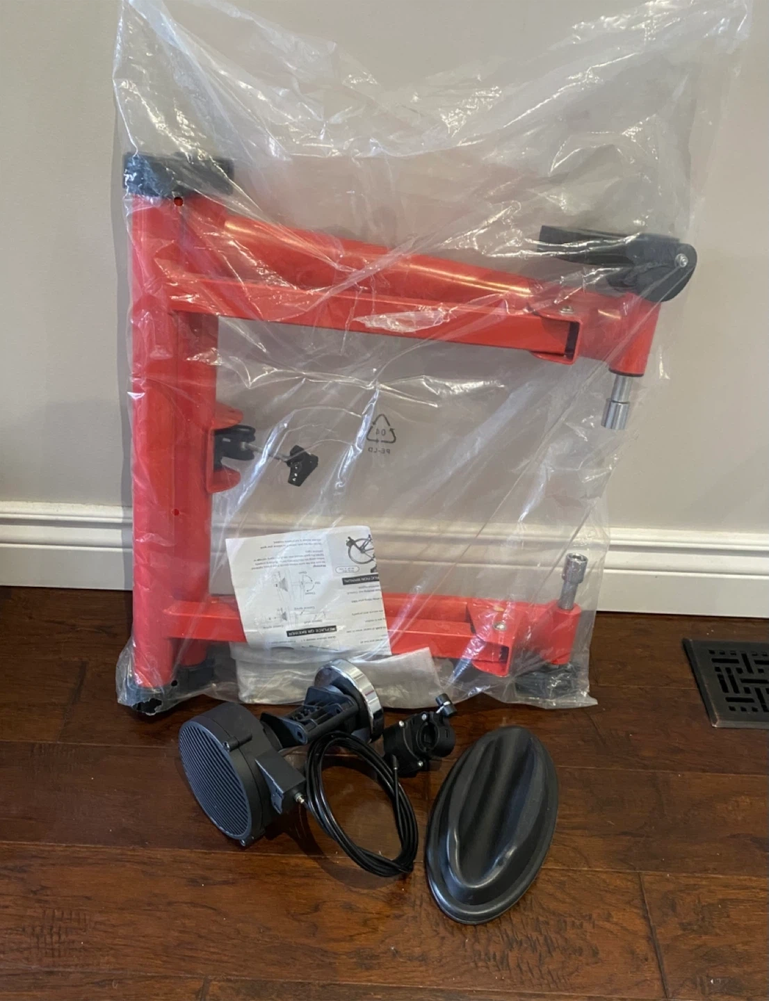 This bike trainer stand allows you to cycle indoors. It includes the trainer frame, a resistance unit, and a front wheel riser block. It's made of metal and plastic. Brand new, never used. Pick up at Weston and Eglinton.
