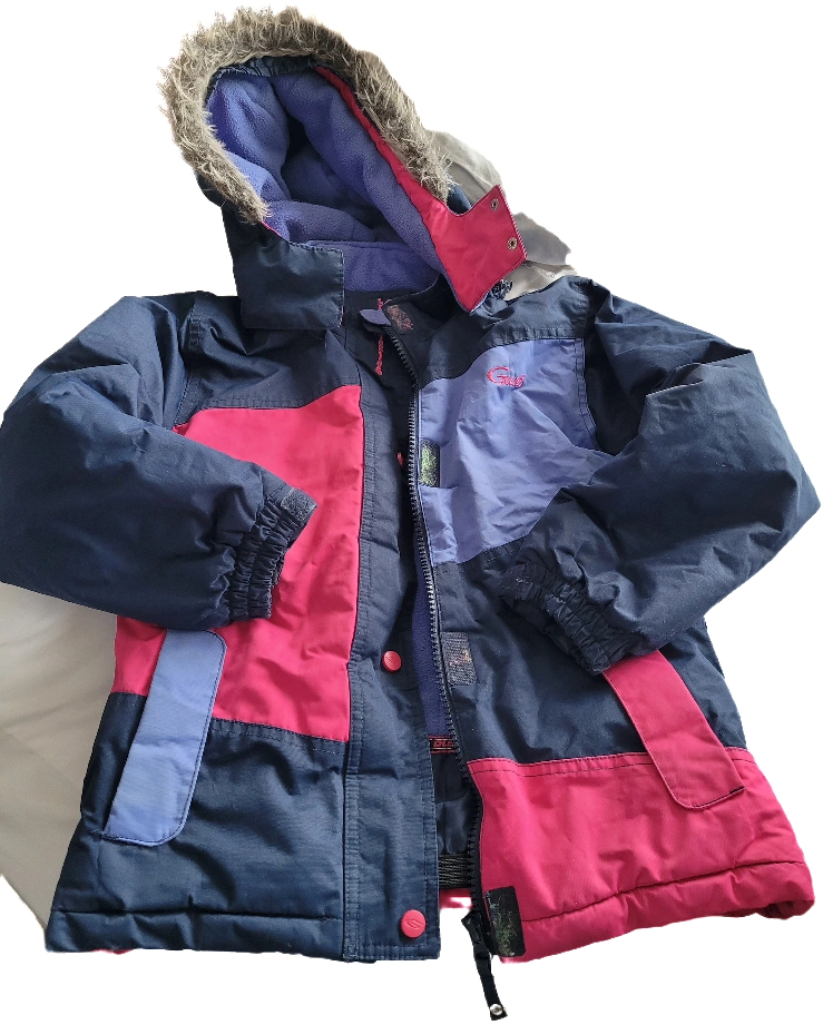 Girls' ski jacket. Blue, pink, and purple. Fleece lined with faux fur hood. Size 8 (128)