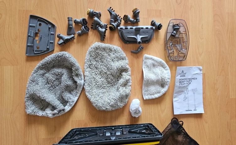 Heavy duty steam mop comes with pretty much all accessories and mop heads.