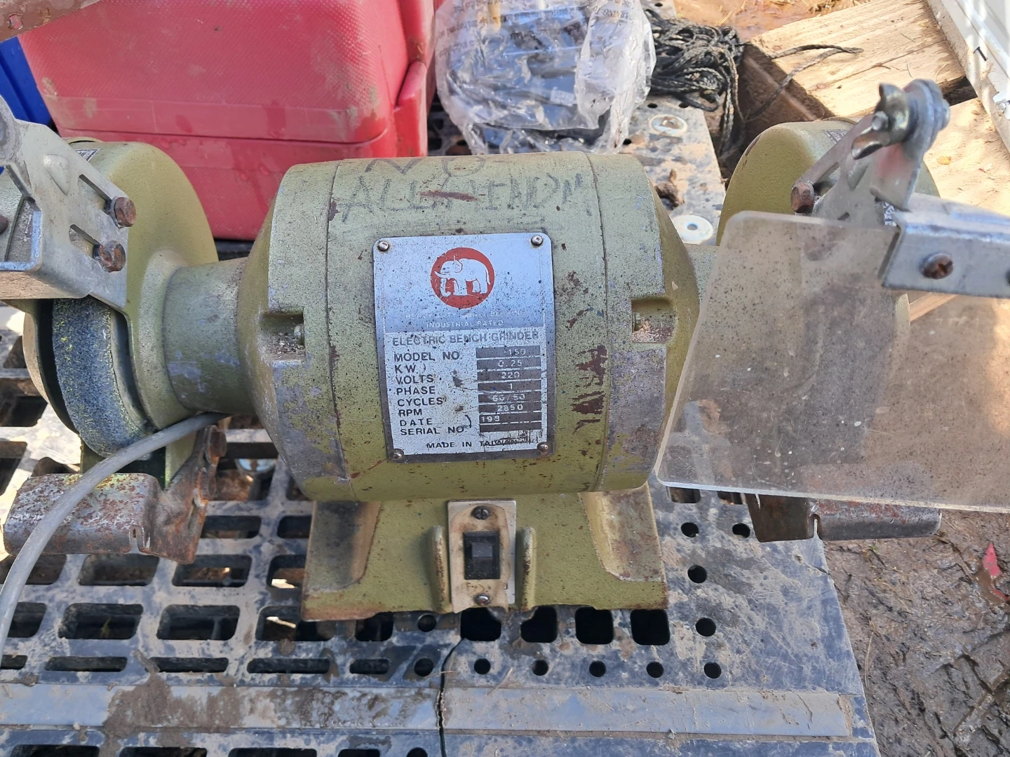 This is a Mammoth electric bench grinder. It runs on 220 volts and has a 0.25 KW motor. The grinder operates at 2850 RPM. This would be useful for sharpening tools or light grinding tasks.