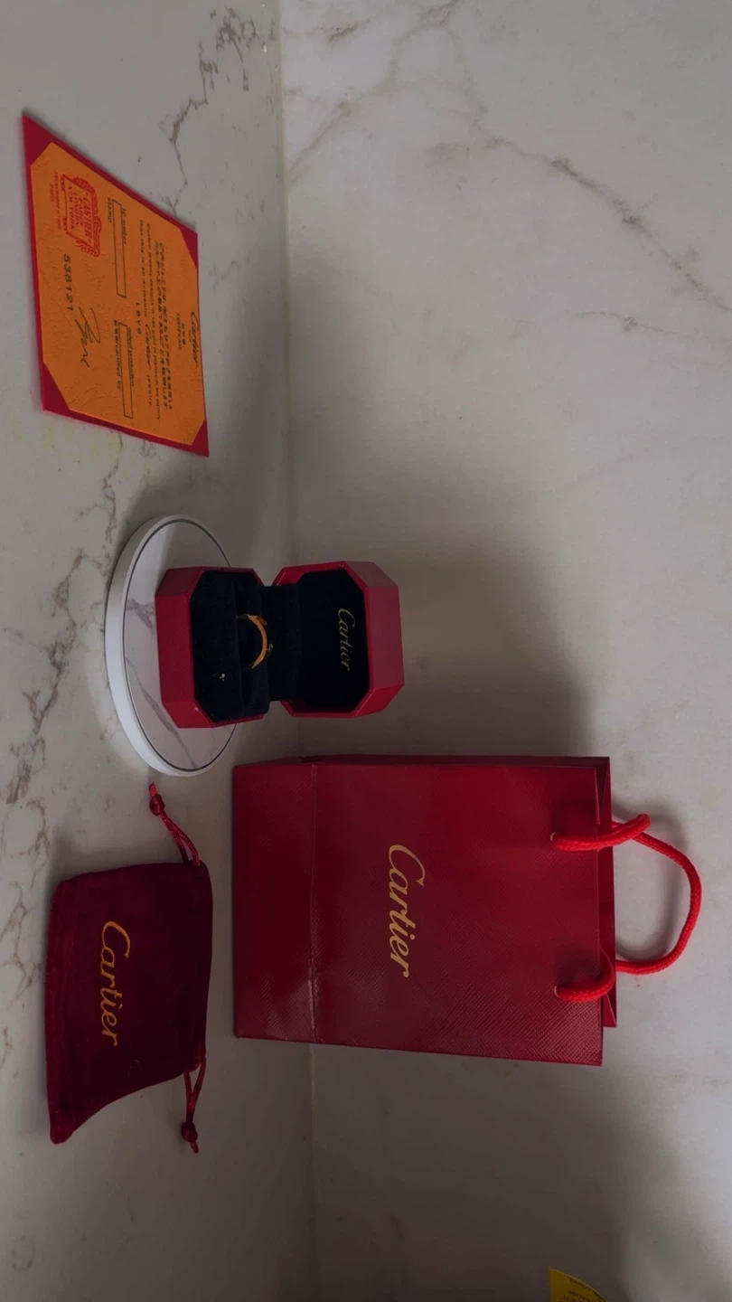 Genuine Cartier ring presented in its original red box and outer shopping bag. It also comes with a small red pouch and a certificate of authenticity. This piece is from the Love collection.