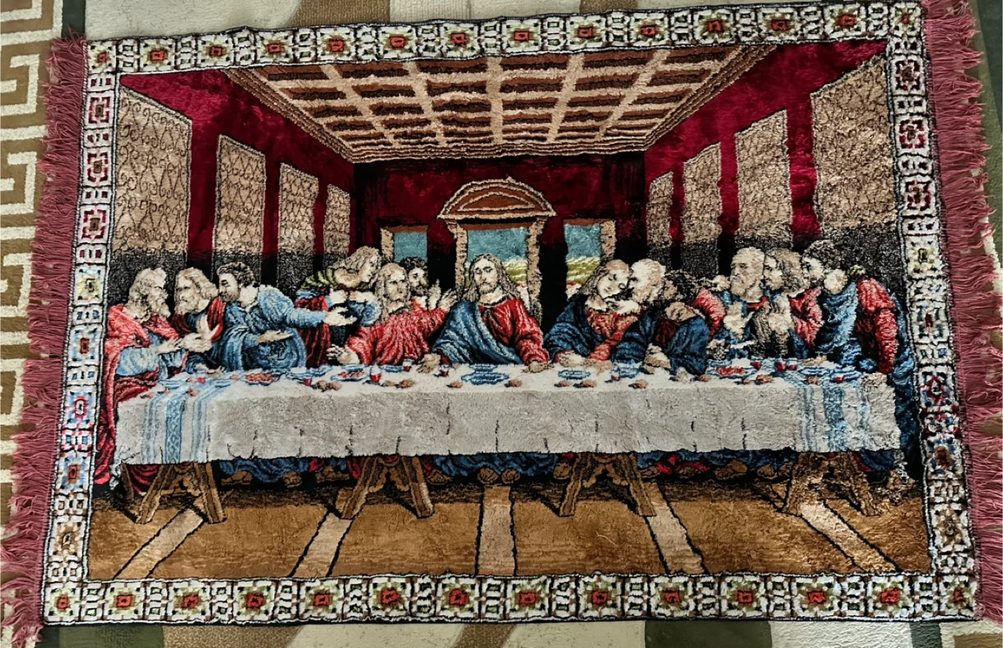 This tapestry depicts Leonardo da Vinci's 'The Last Supper'. It features intricate details and rich colours. The tapestry has fringed edges and a decorative border.