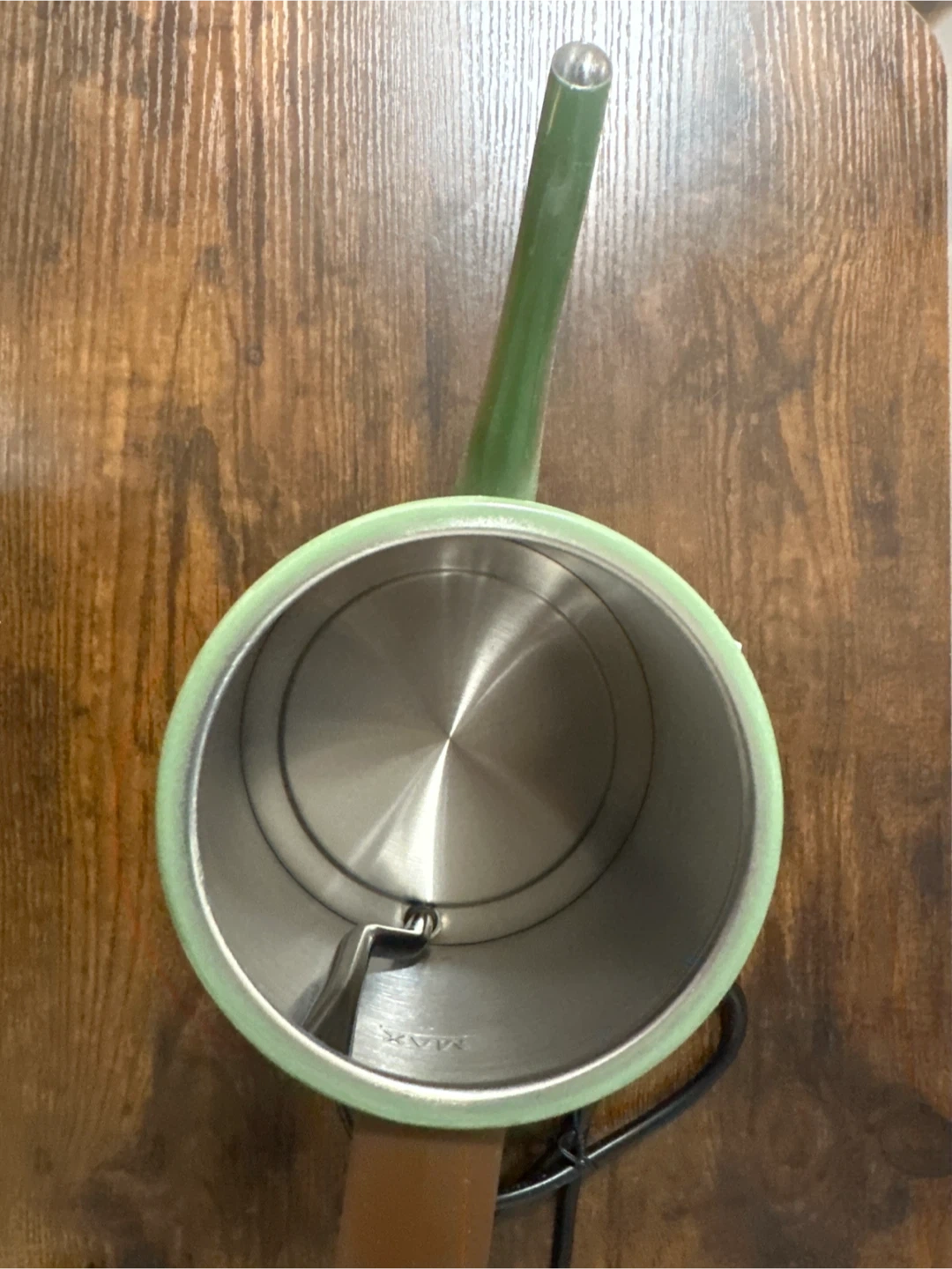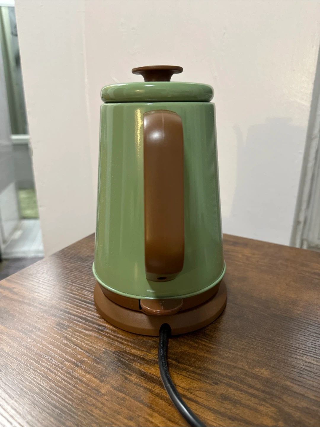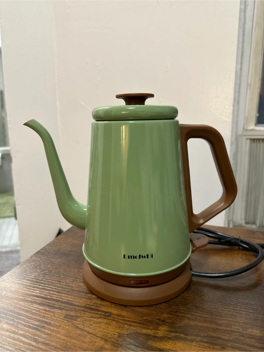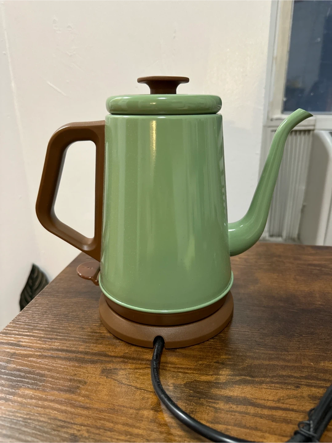 This electric gooseneck kettle features a slender spout for precise pouring. It's constructed with a durable metal interior and a comfortable handle. Perfect for coffee and tea enthusiasts!