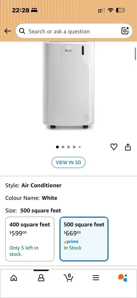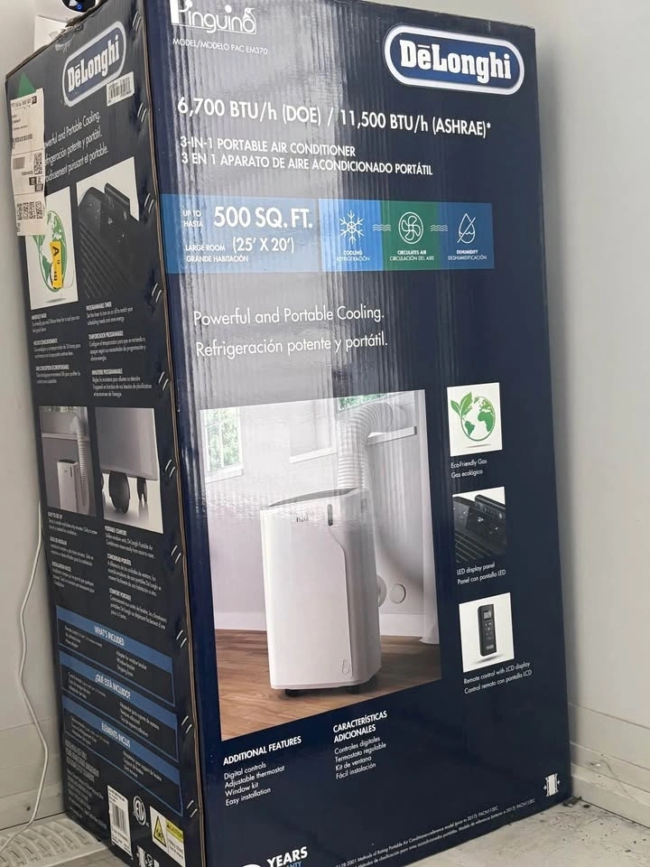 Selling a DeLonghi portable air conditioner (Model: PACEM370-6AL WH). Used for 1 year, in excellent condition and works perfectly. Covers up to 500 sq.ft (good for large rooms) with strong cooling performance. It's clean and well maintained. Comes with remote control and exhaust hose. Easy to move with wheels. This unit is like new, no issues. Selling because it's no longer needed. Condition: 9/10 (very clean, fully functional). Pickup only. Serious buyers please.