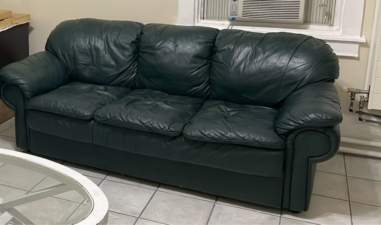 Comfortable three-seater sofa upholstered in dark green leather. This sofa features plush cushions and rolled armrests. It's perfect for a living room or den!