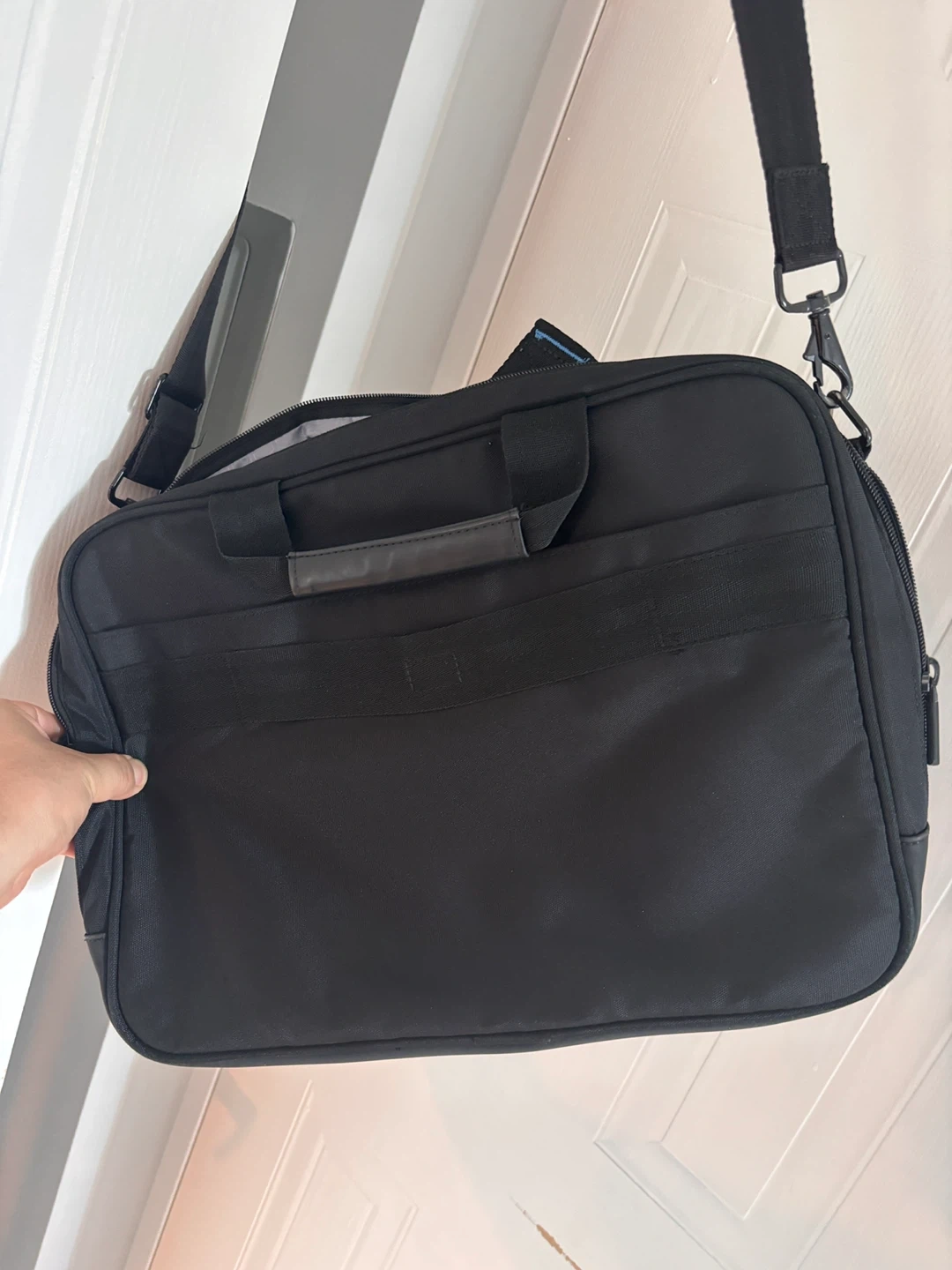 Black Dell laptop bag with multiple compartments and adjustable shoulder strap. It's made from durable nylon material. Plenty of pockets for organization!