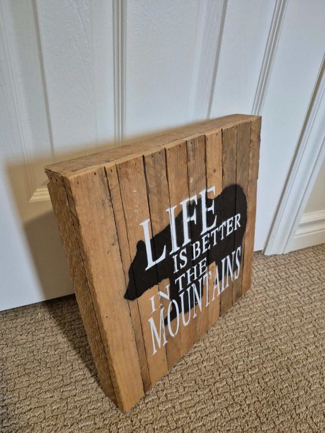 Rustic wooden wall sign featuring a black bear silhouette and white text that reads 'LIFE IS BETTER IN THE MOUNTAINS'. It's made of assembled wooden planks. This sign would be a nice addition to a cabin or nature-themed decor.