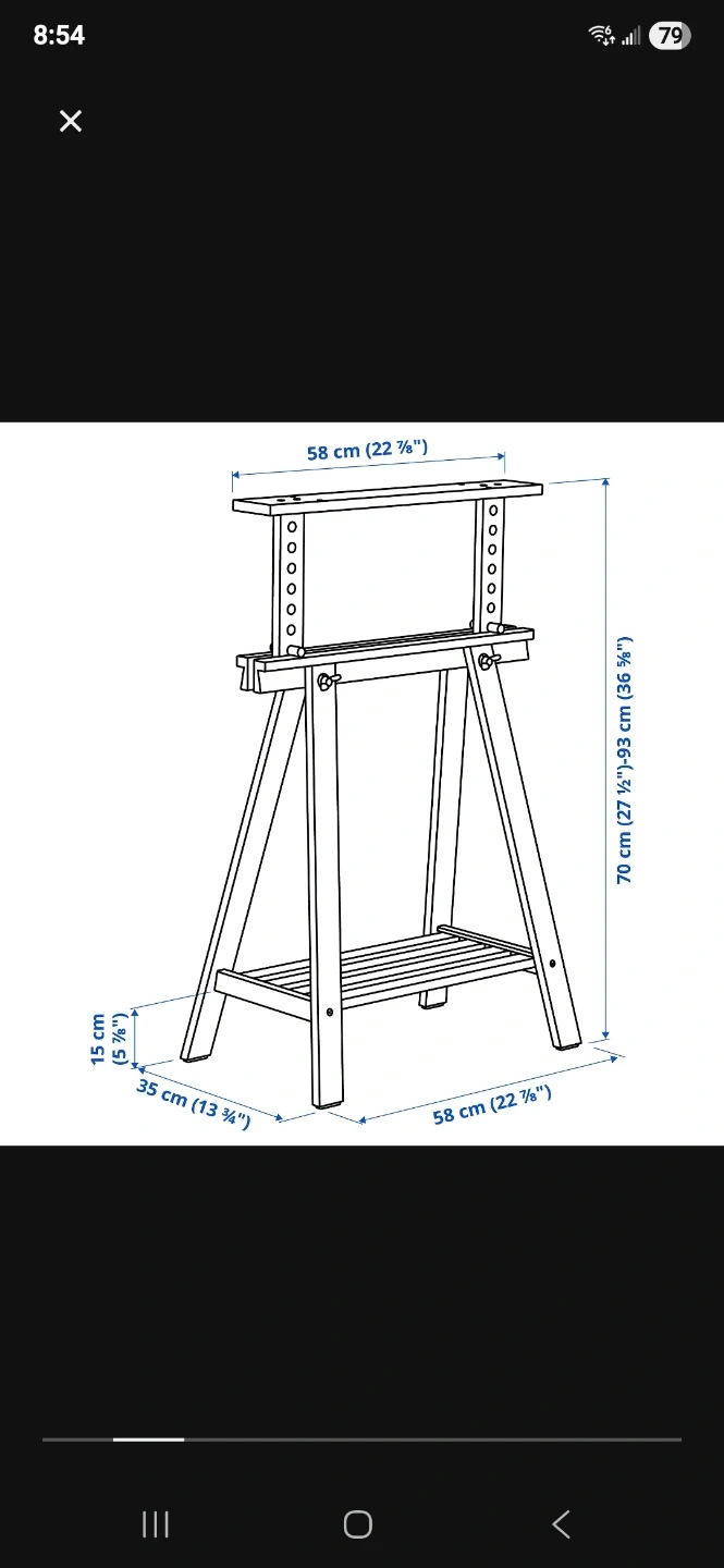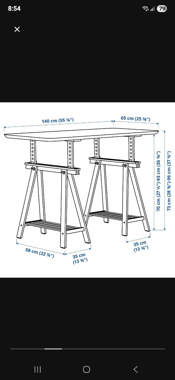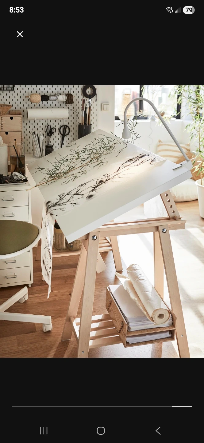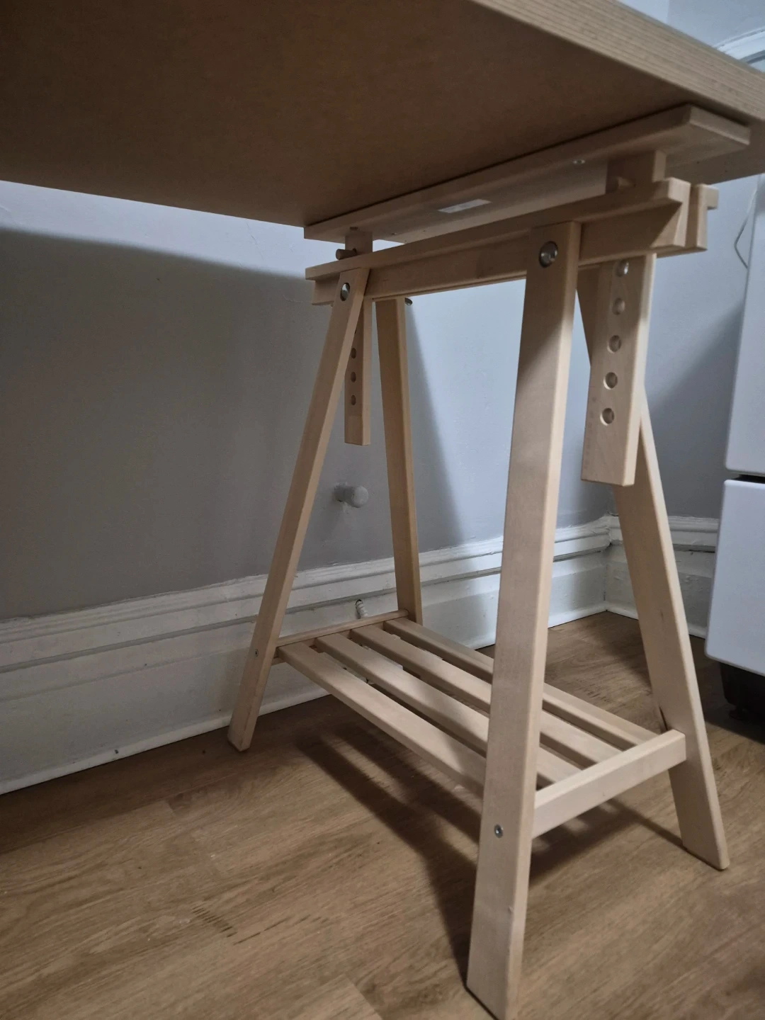 This IKEA drawing desk offers a spacious white tabletop and a sturdy wooden trestle base. It's adjustable in height, making it suitable for various projects. The trestles include shelves for convenient storage. White tabletop and natural wood frame.