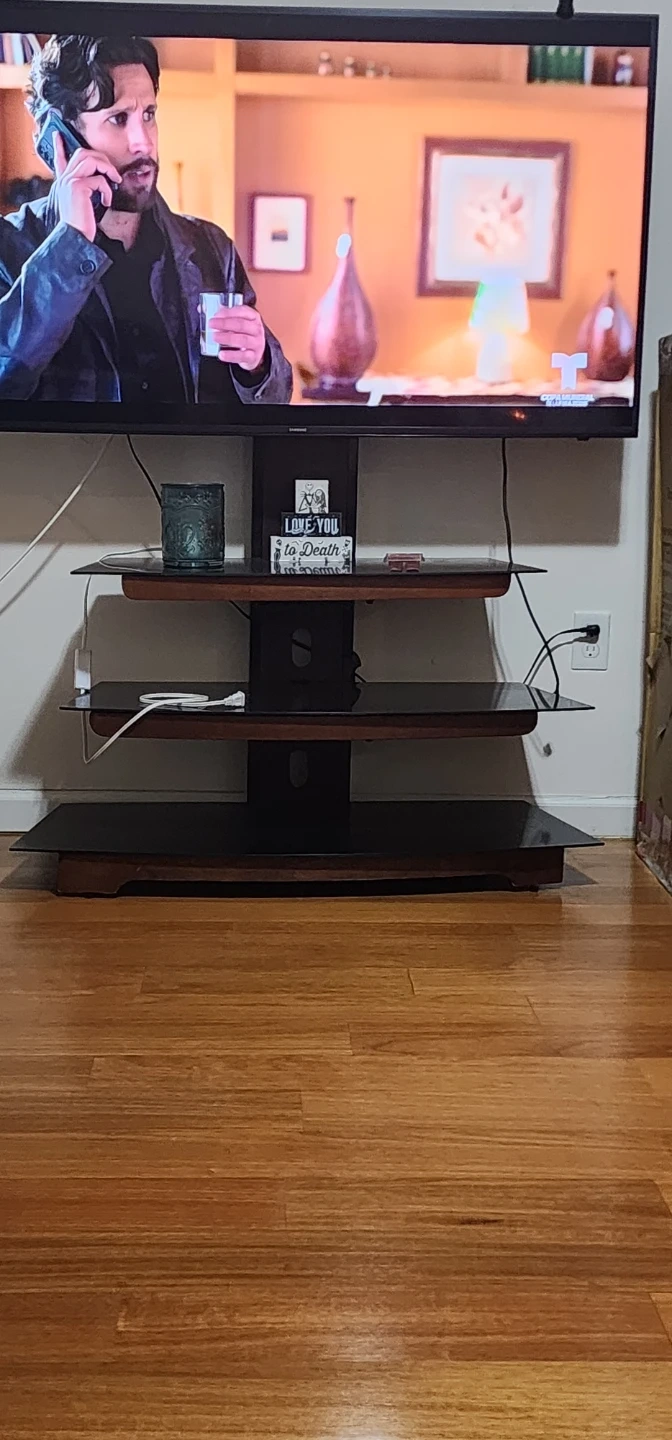 This media console has multiple shelves for your electronics. It features a dark wood frame with clear glass shelves. It's a functional and stylish piece for your living room.
