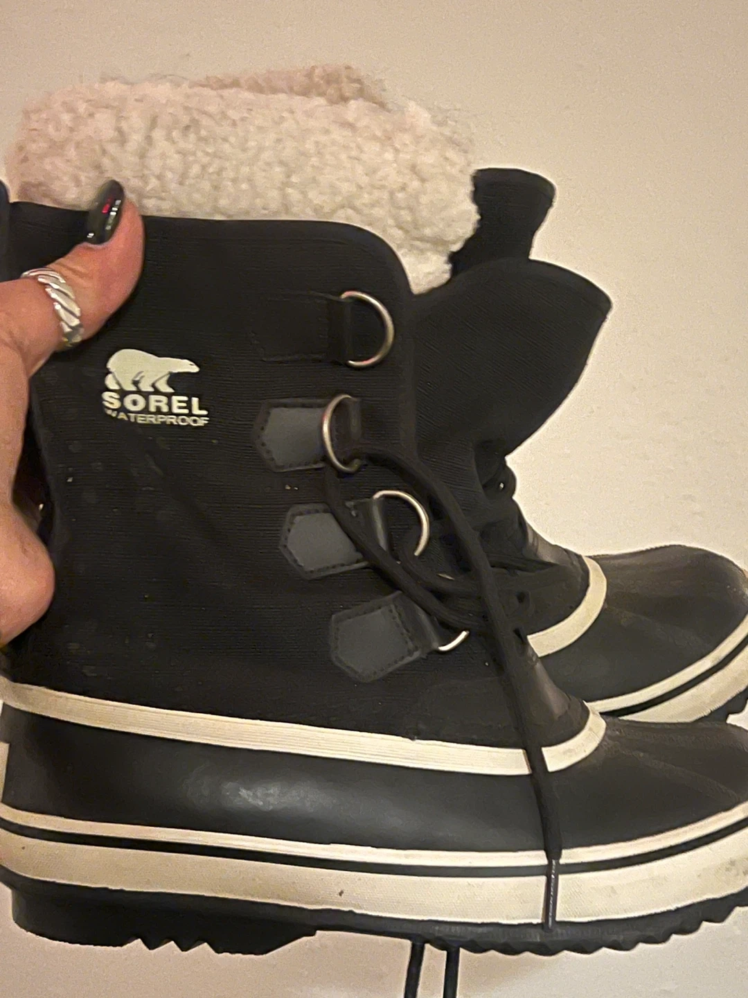 These Sorel boots are waterproof and made for winter weather. They feature faux fur lining for warmth. Made in Vietnam. Size 6 USA, 4 UK, 37 EUR, 23 CM.