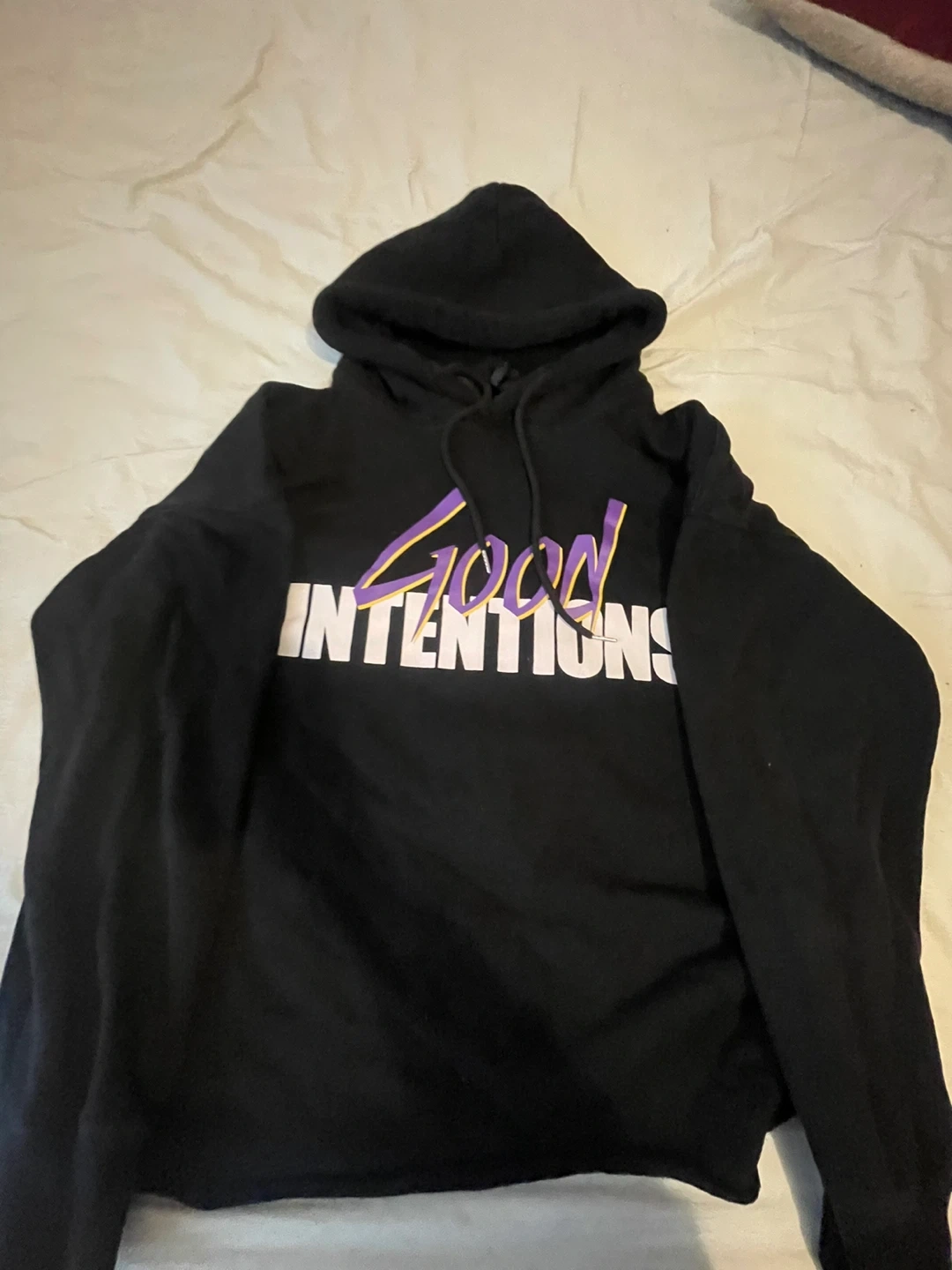 Black Vlone hoodie with "Good Intentions" text on the front. The back features a large purple V with birds. It's made of a soft material. This hoodie is great for casual wear.