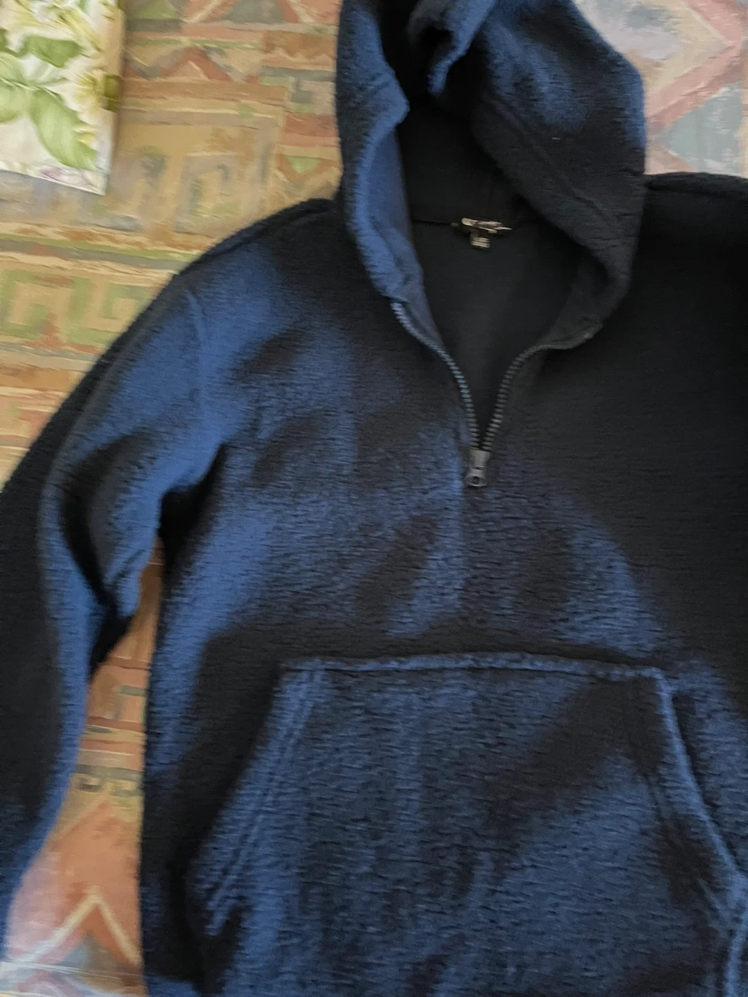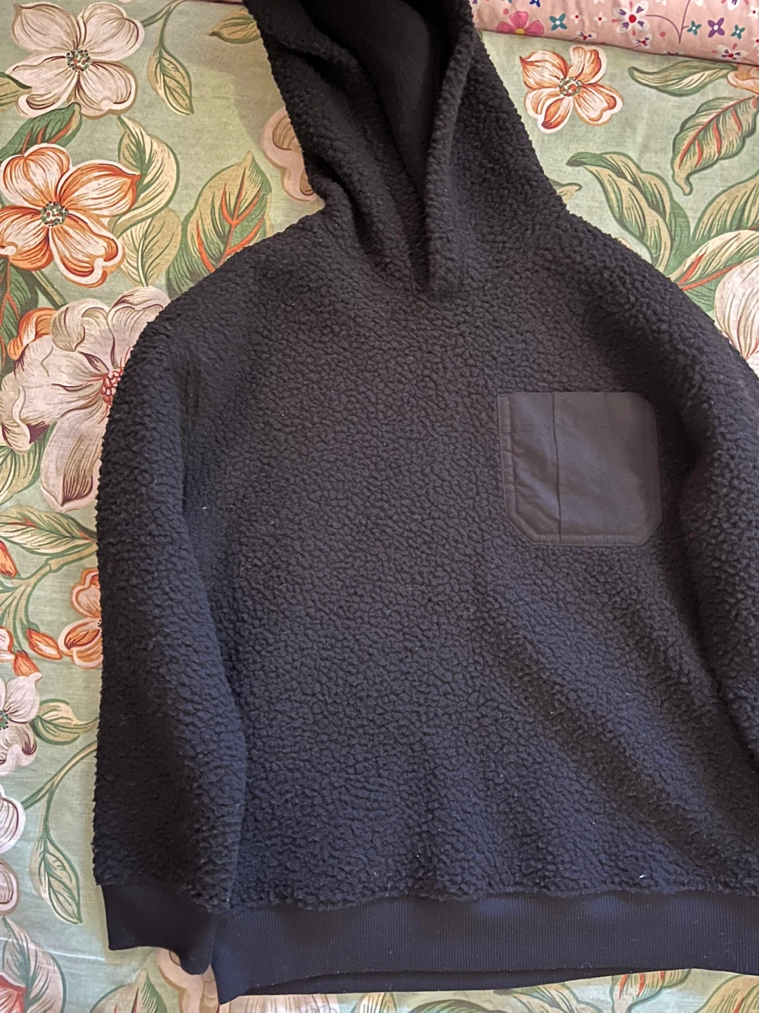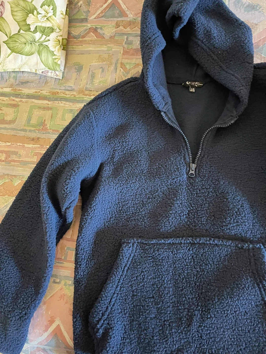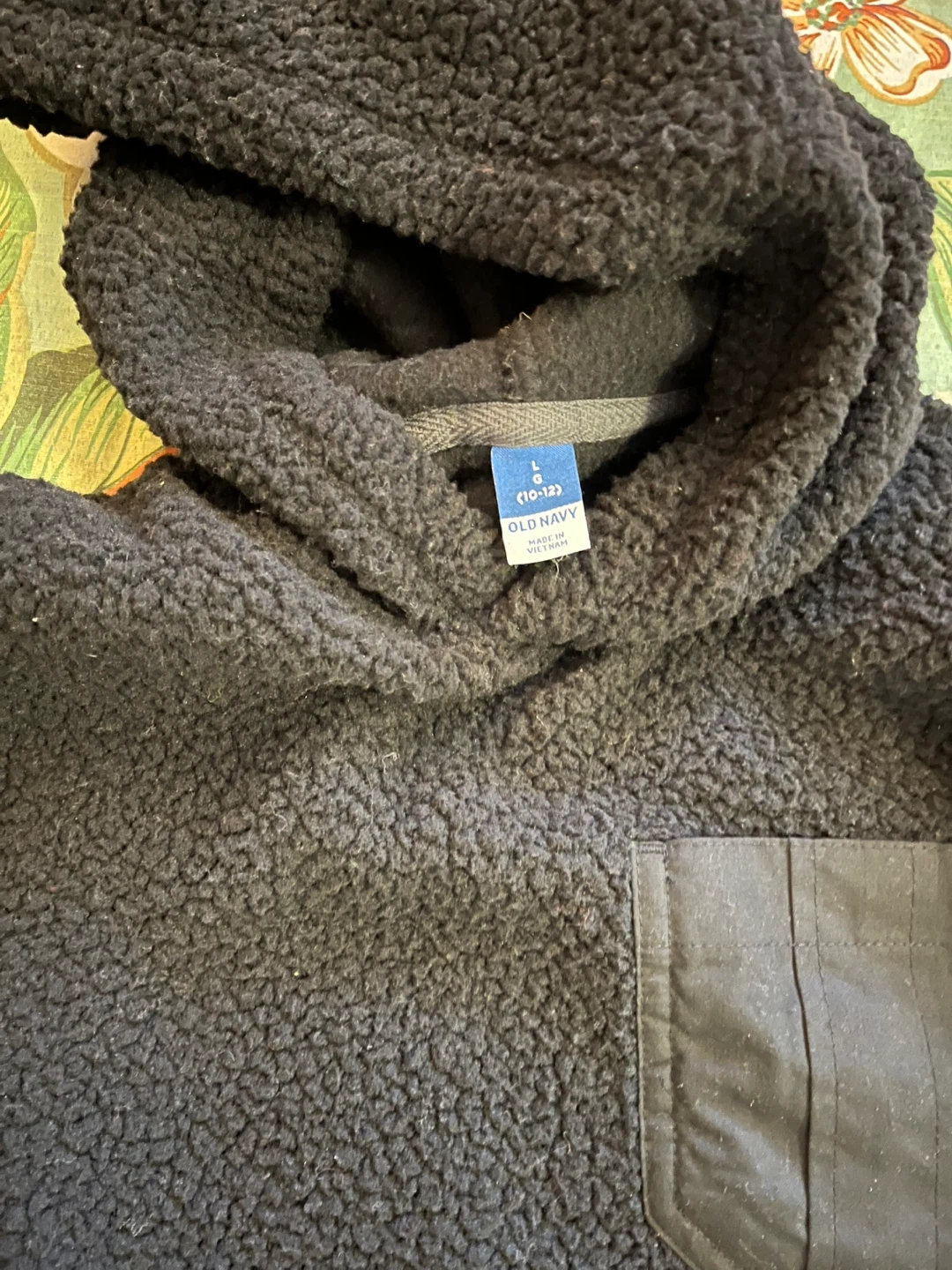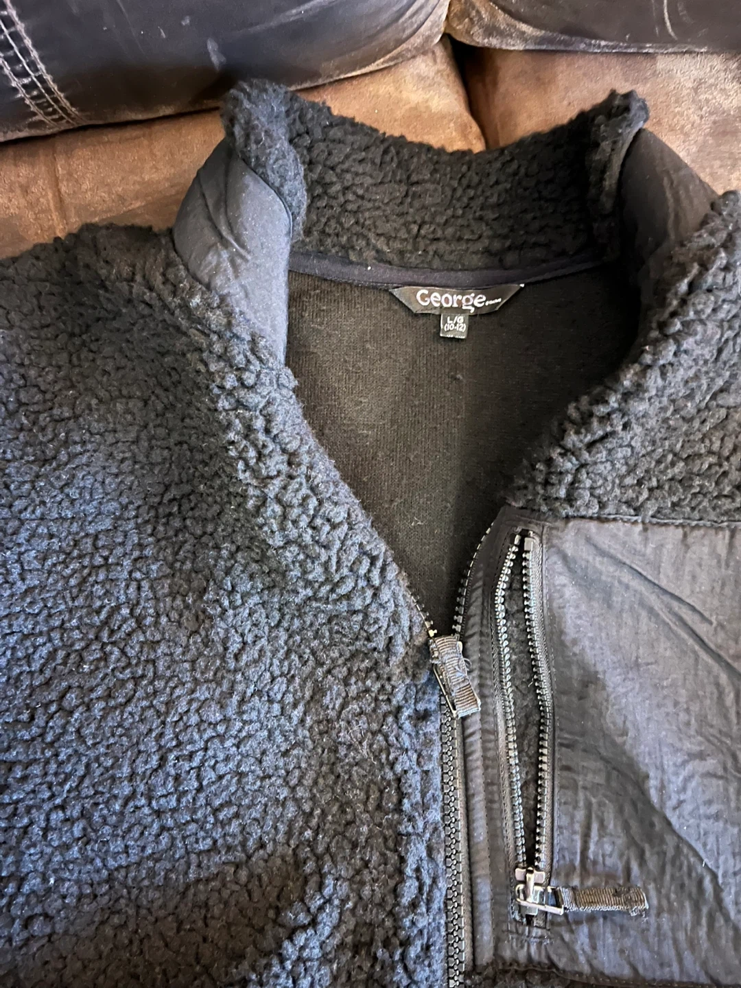 George brand black hoodie made of soft fleece material. It has a kangaroo pocket and a quarter zip closure. Size L (10-12).