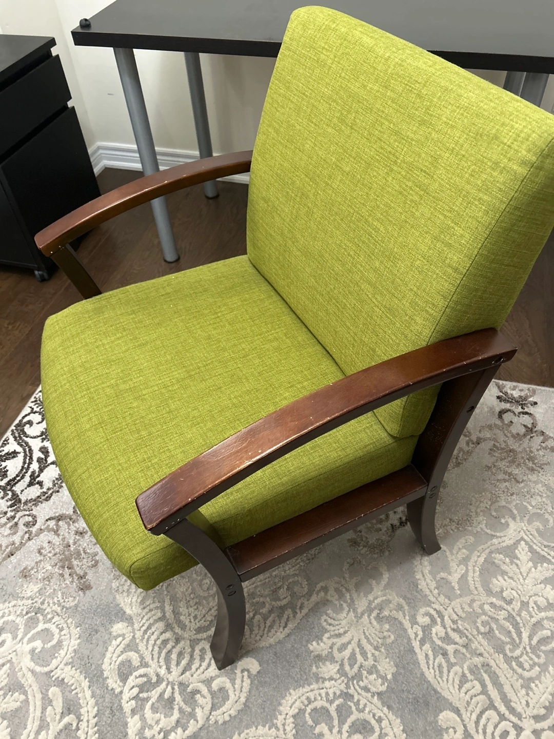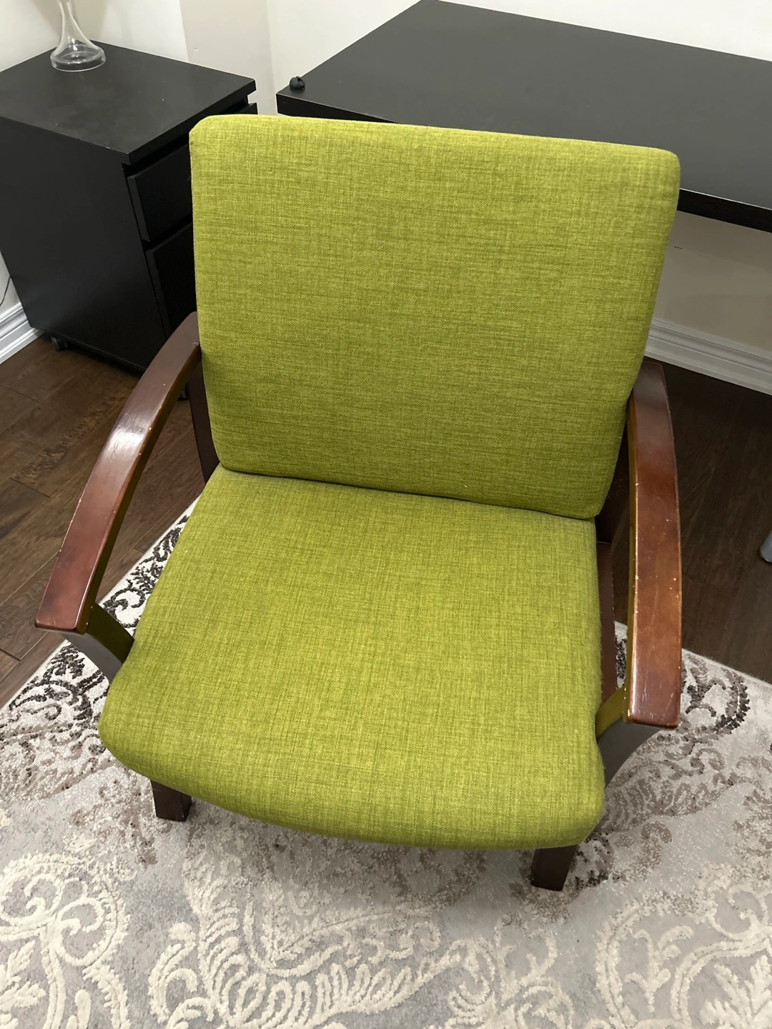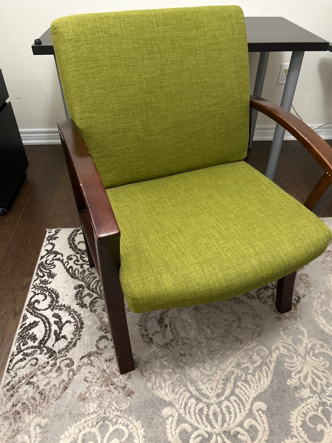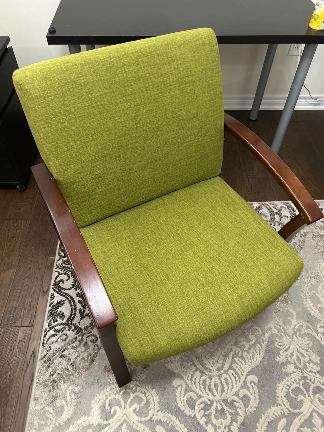 Comfortable accent chair. Lime green fabric upholstery. Dark brown wooden armrests. Suitable for living room or office.