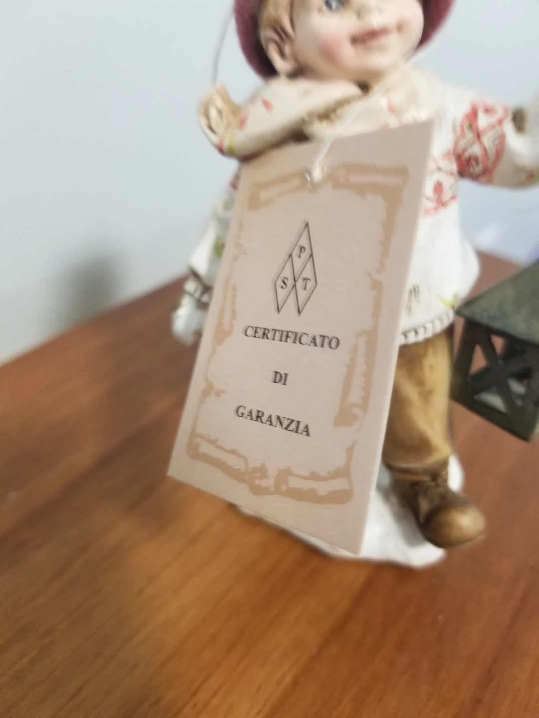This charming collectible figurine depicts a young boy dressed in winter attire, holding a lantern. It appears to be made from a resin or ceramic material. A 'Certificato di Garanzia' tag is attached. It's a lovely decorative piece for any shelf or mantel. 5 inch