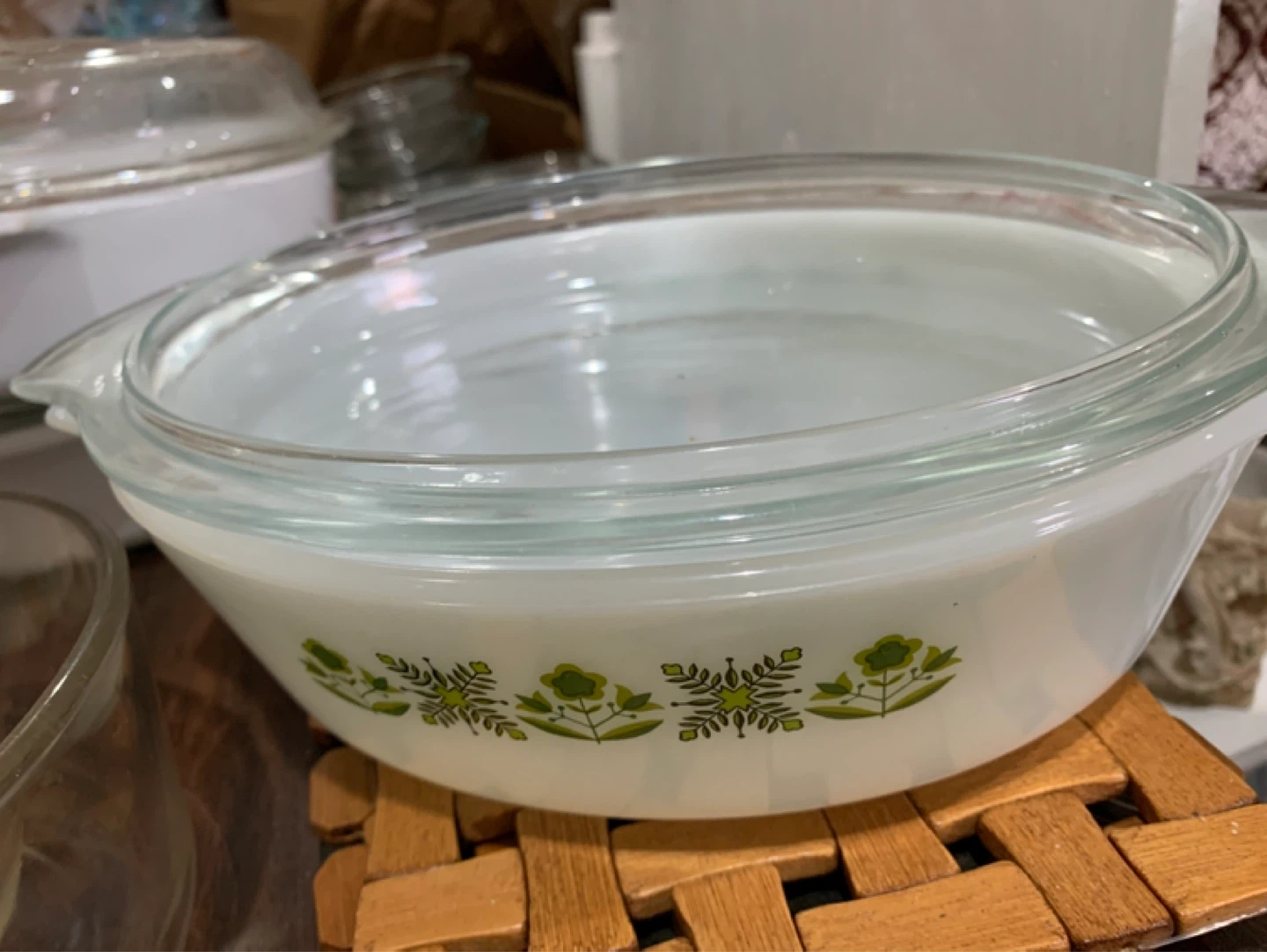 This is a white Pyrex mixing bowl with a green floral pattern. It's made of glass and has a capacity of 1.5 quarts. It's microwave and oven safe.
