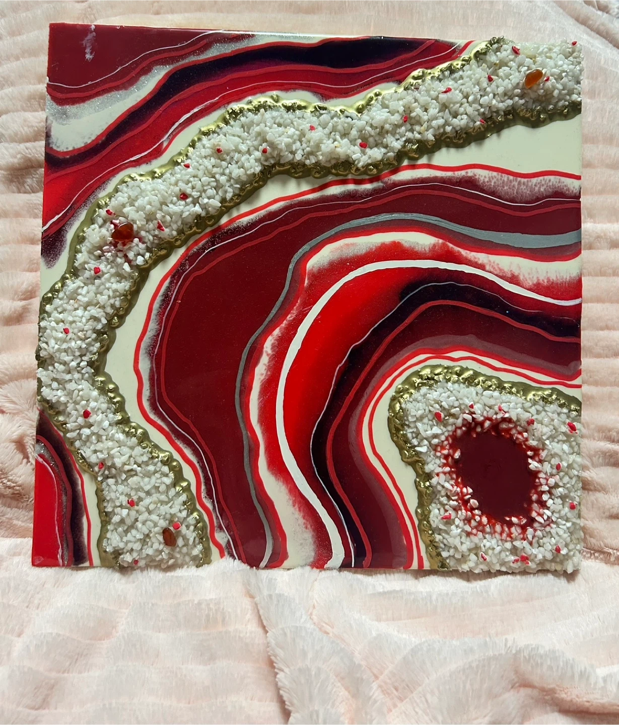 Decorative agate slice art featuring swirling red, white, and black resin. It's embellished with a textured border of small white pebbles and gold accents. This unique piece would add a striking visual element to any home decor.