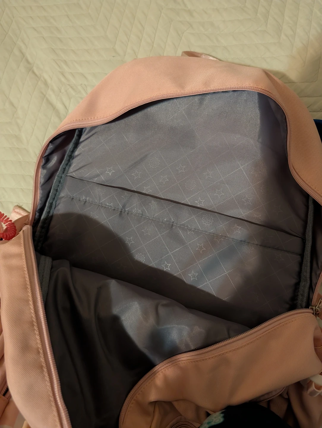 This pink backpack has a checkerboard pocket on the front and comes with cute charms. It features multiple zippered compartments for organization. The interior is lined with a star pattern.