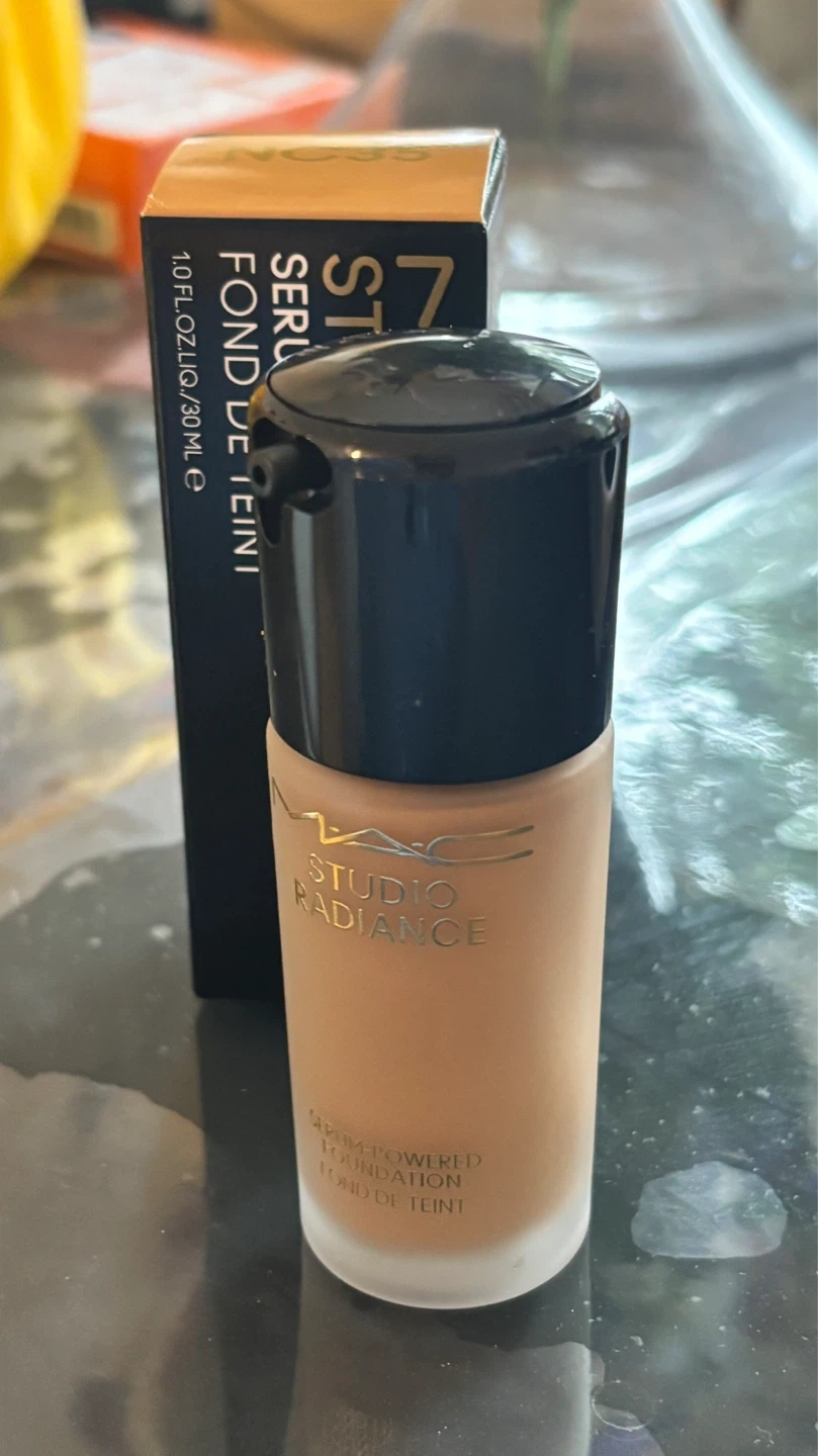 This is the MAC Studio Radiance Serum-Powered Foundation in shade NC35. It's a 1.0 fl.oz. / 30ml bottle. The foundation provides a serum-powered finish.