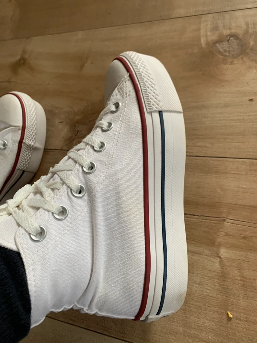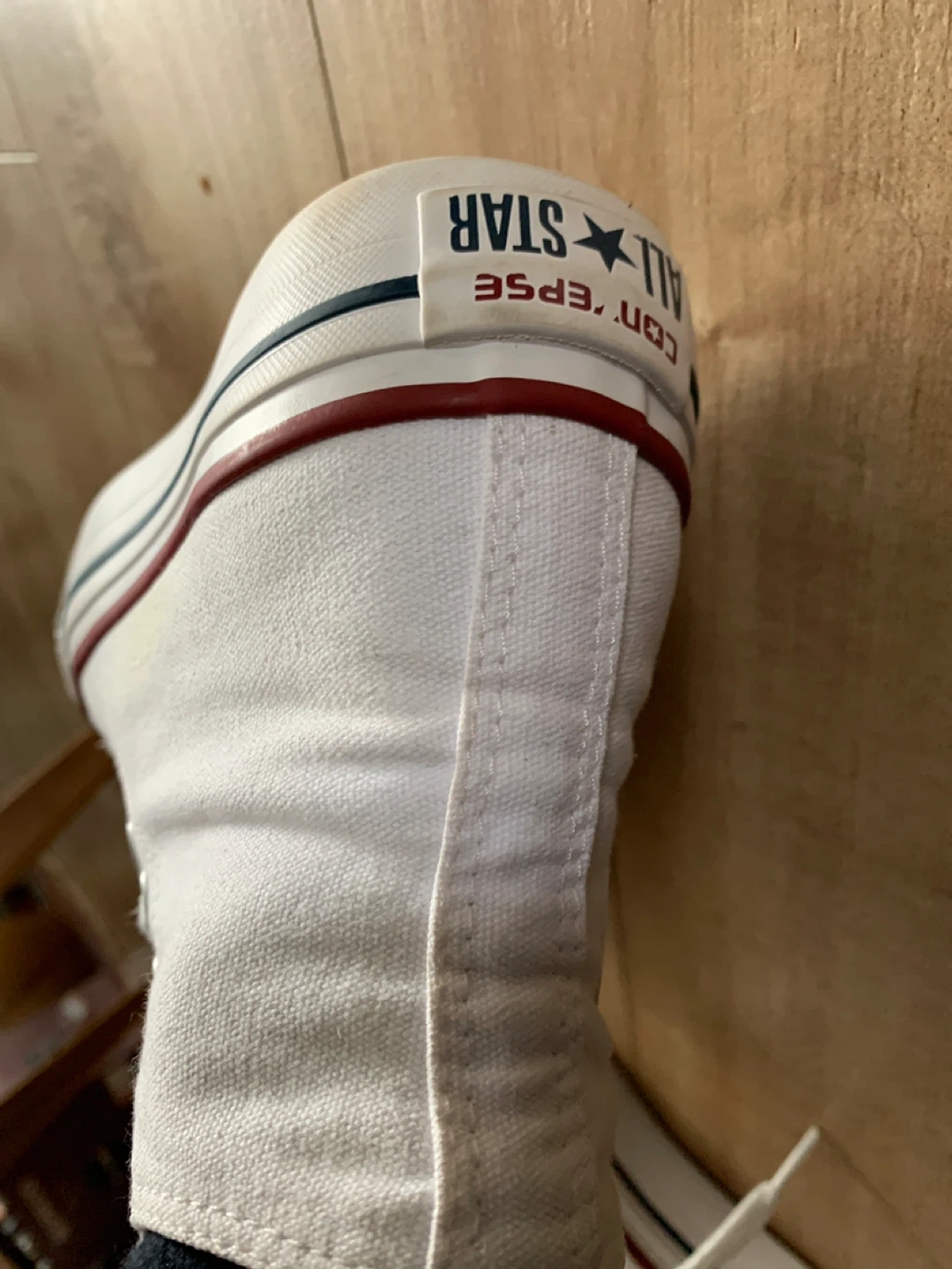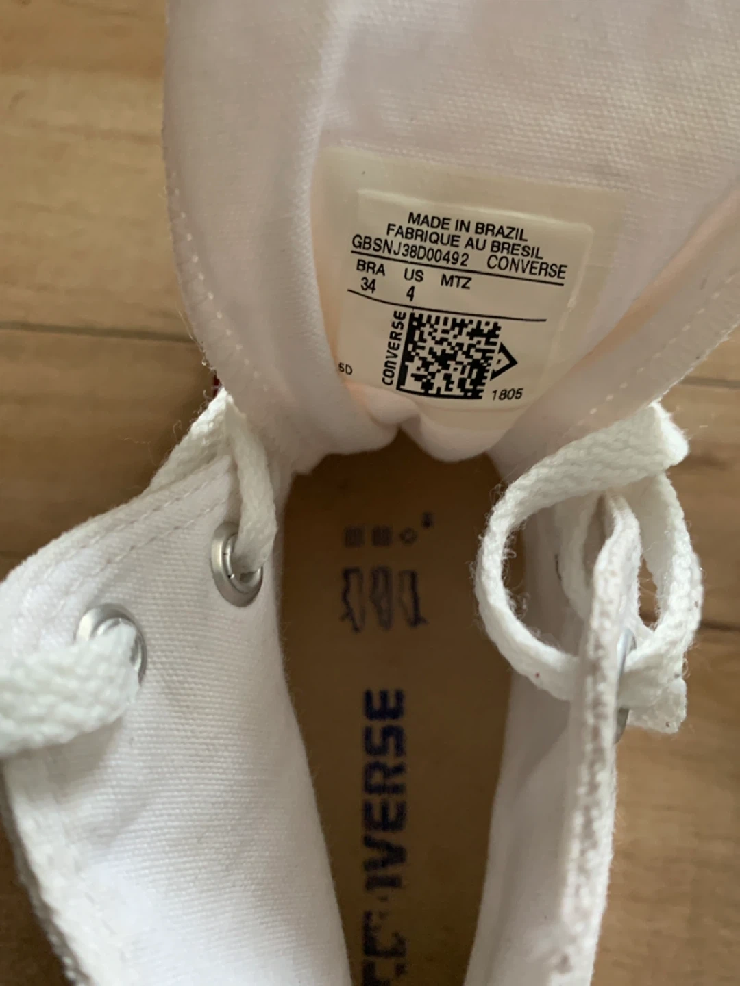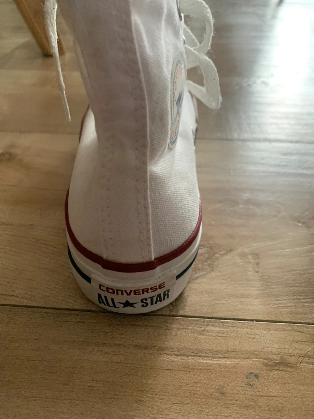 Classic white Converse high-top sneakers. Canvas upper with rubber toe cap and sole. Features the iconic All Star logo patch. A timeless footwear choice for casual wear.