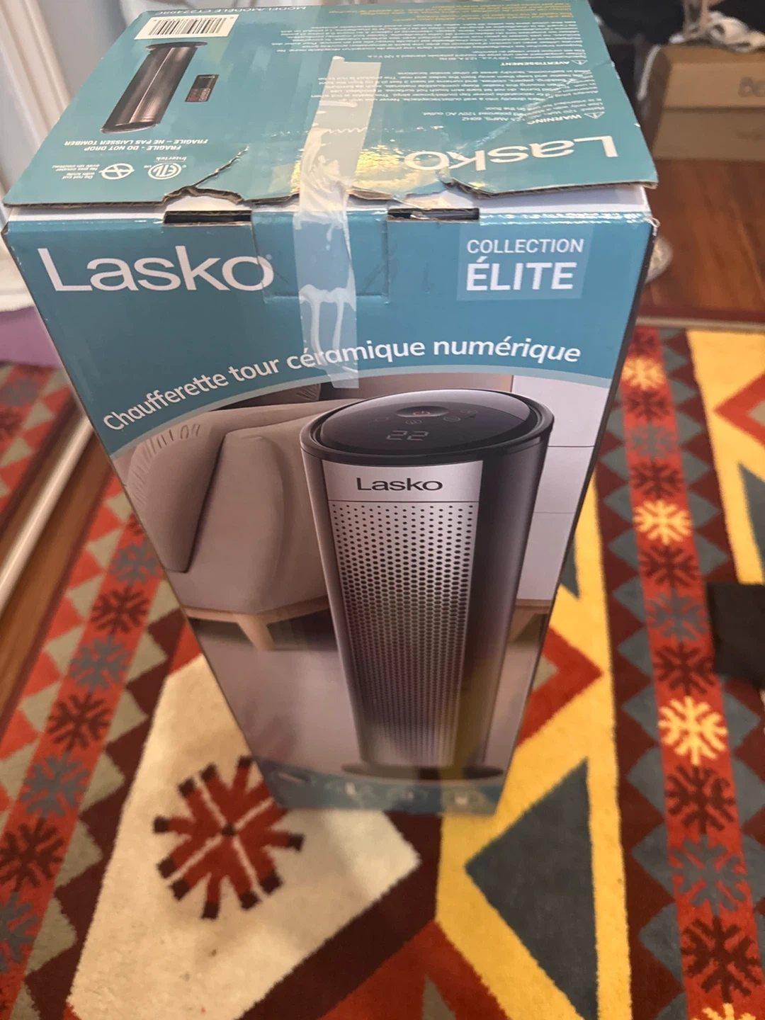 Lasko Digital Ceramic Tower Heater. It features touch sensing technology, a dimmable display, and oscillation control. Includes 3 heat settings and 12-hour auto shut-off timer. This heater is 1500 Watts.