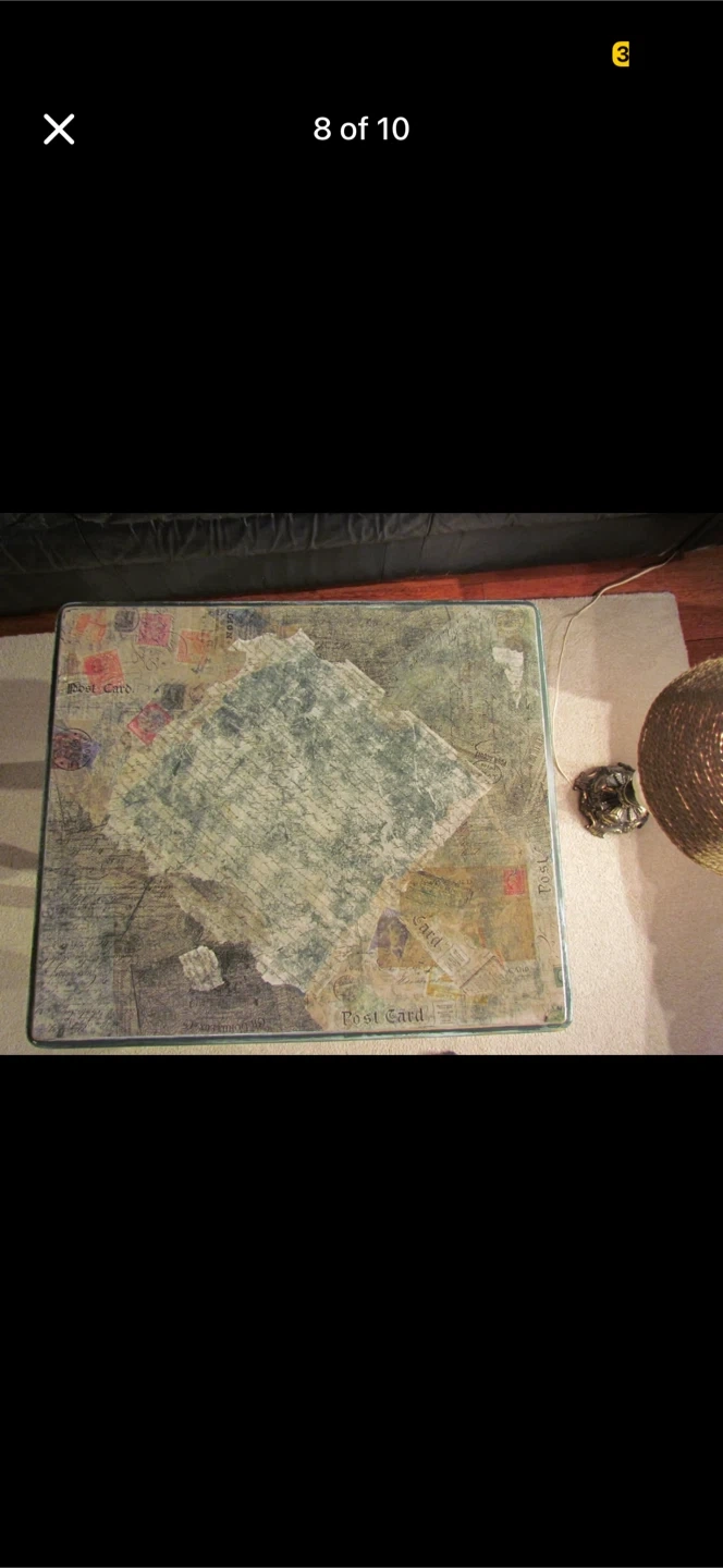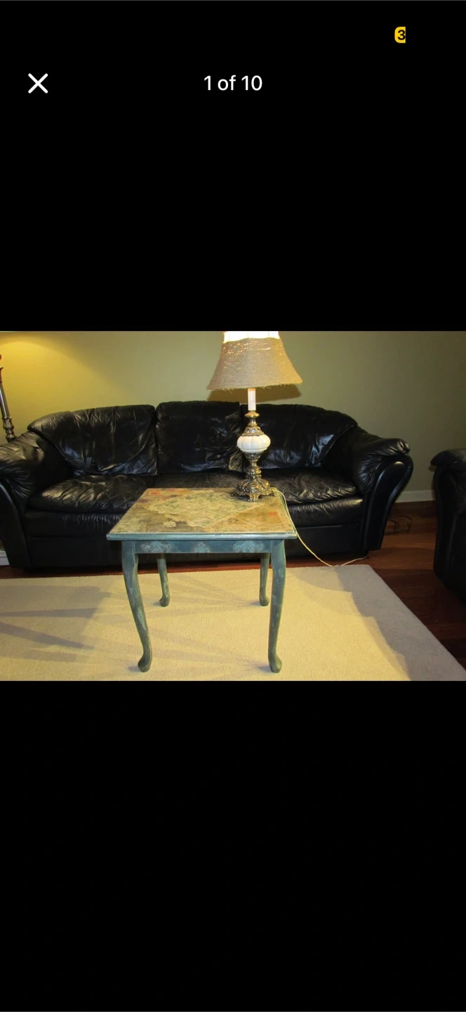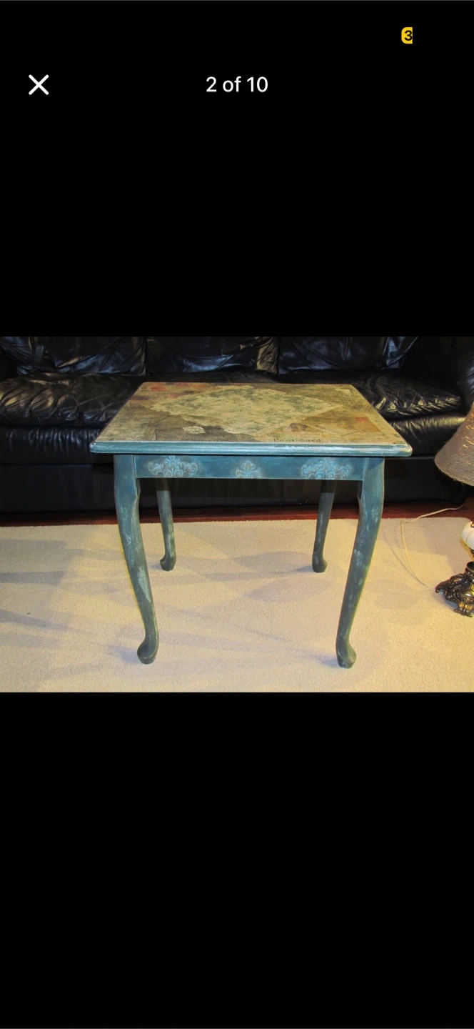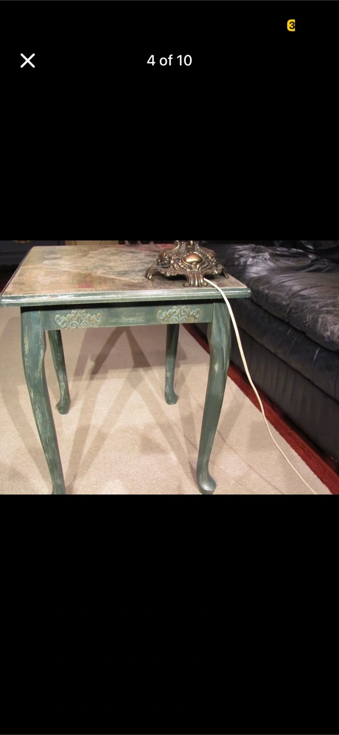This is a quaint accent table with a distressed green finish. It features delicate floral carvings on the apron and cabriole legs. The tabletop has a detailed scenic print.