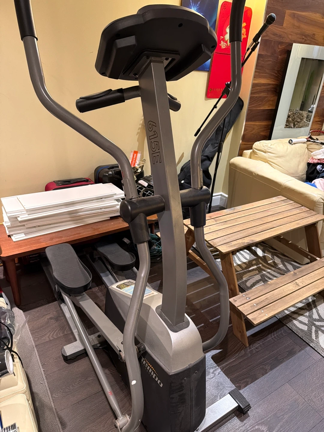 Tempo Fitness 615E elliptical with a 14.3 lb flywheel. It offers 20 levels of resistance and a 16" stride length. Max user weight capacity is 250 lbs.
