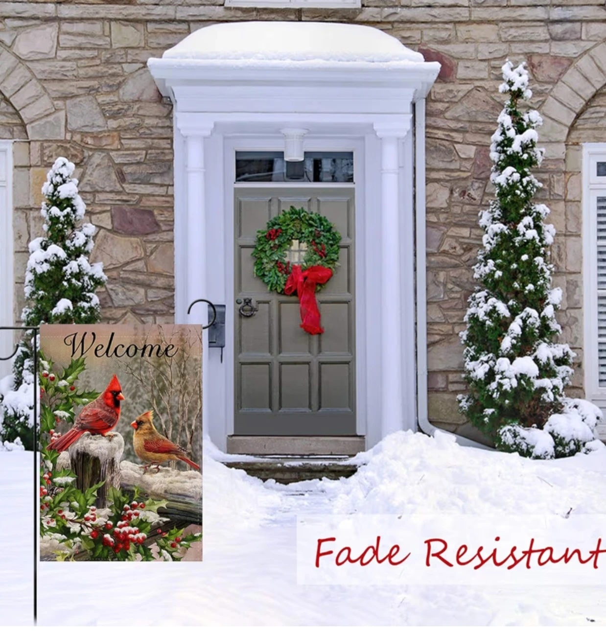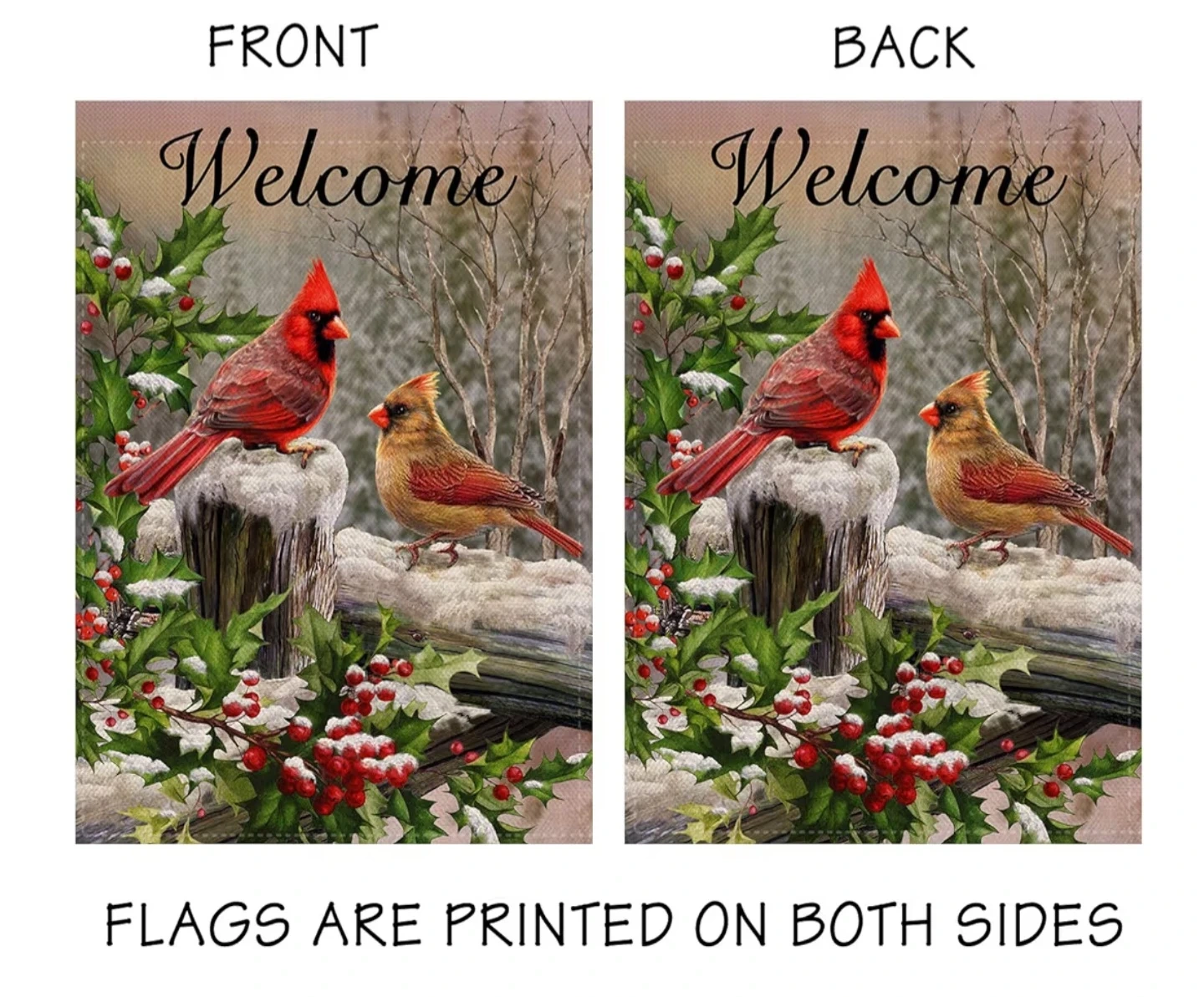 This fade-resistant garden flag features a winter scene with two cardinals, holly, and berries. The "Welcome" text is printed on both sides. It's perfect for adding a festive touch to your yard during the colder months.