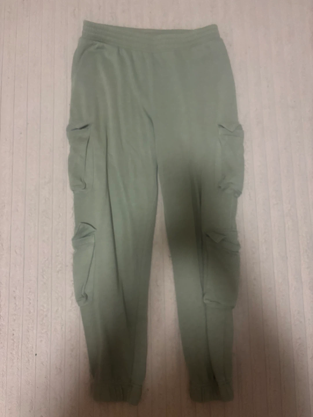 Comfortable light green cargo sweatpants with an elastic waistband and cuffs. They're made of a soft material with multiple cargo pockets. Perfect for casual wear and errands!