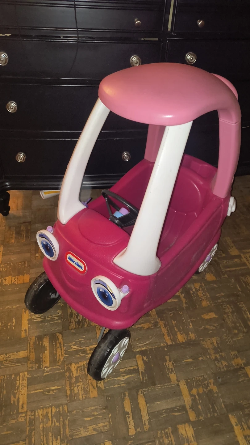 This pink Little Tikes Cozy Coupe ride-on toy car is a fun classic for kids. It has a durable plastic construction and a working steering wheel. It's great for outdoor play and imaginative adventures!