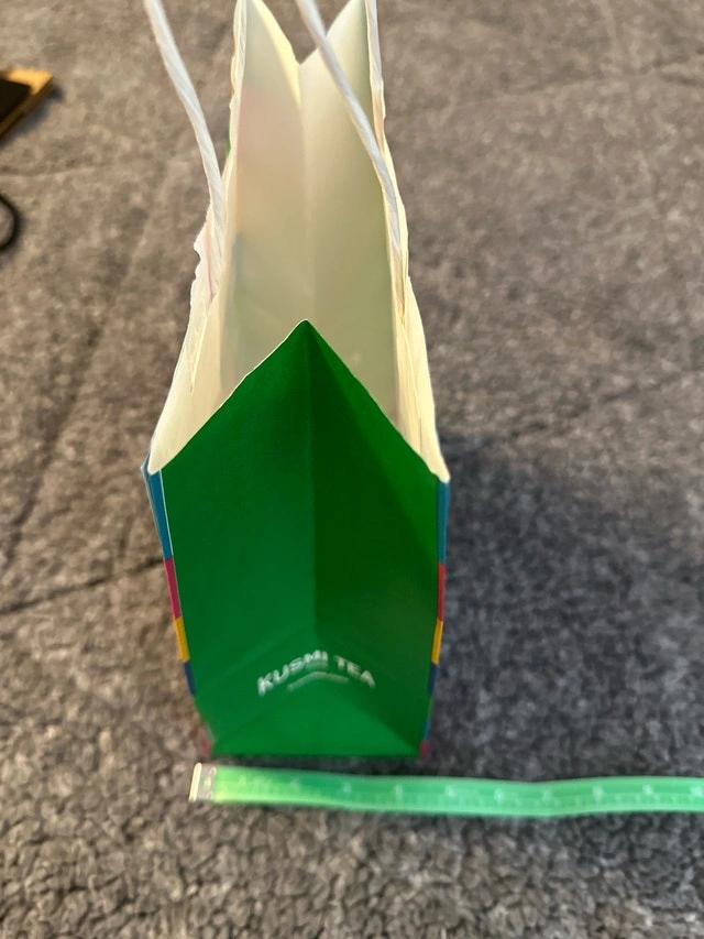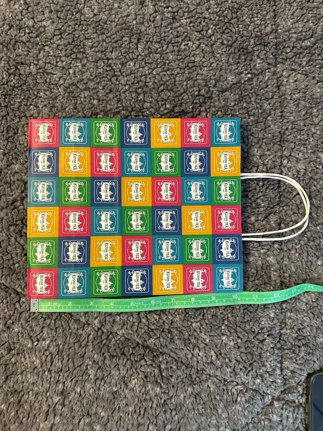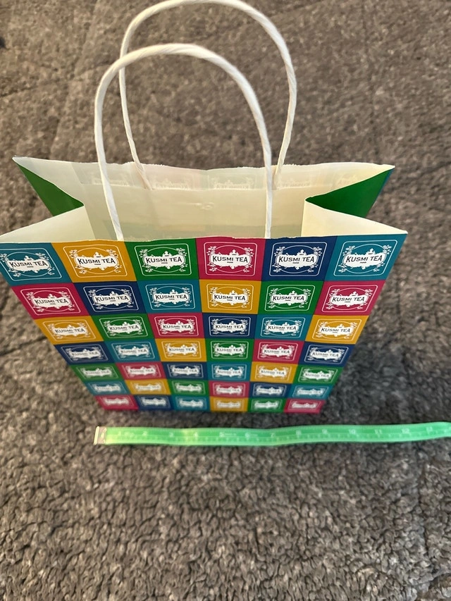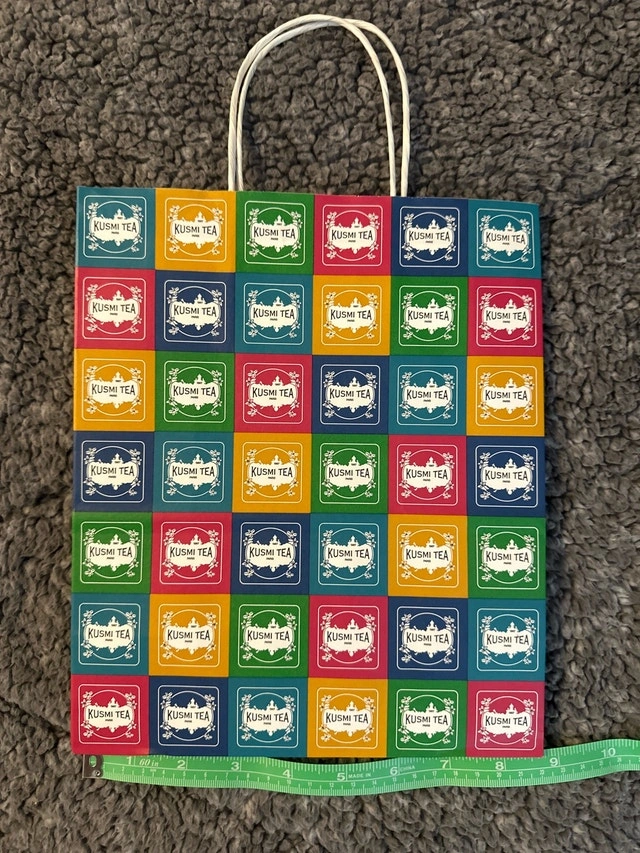 This colourful Kusmi Tea boutique paper gift bag is perfect for any tea lover. It's a designer bag that adds a touch of class to any gift. It measures approximately 9 inches by 8 inches by 3 inches. It is in used condition. Brand: Kusmi Tea, Type: Boutique Gift Bag, Material: Paper, Design: Colourful Kusmi Tea Pattern, Approximate Dimensions: 9" x 8" x 3". Similar bags are listed on Kijiji for between $25 and $50. If the ad is still up, the item is available. Cash accepted.
