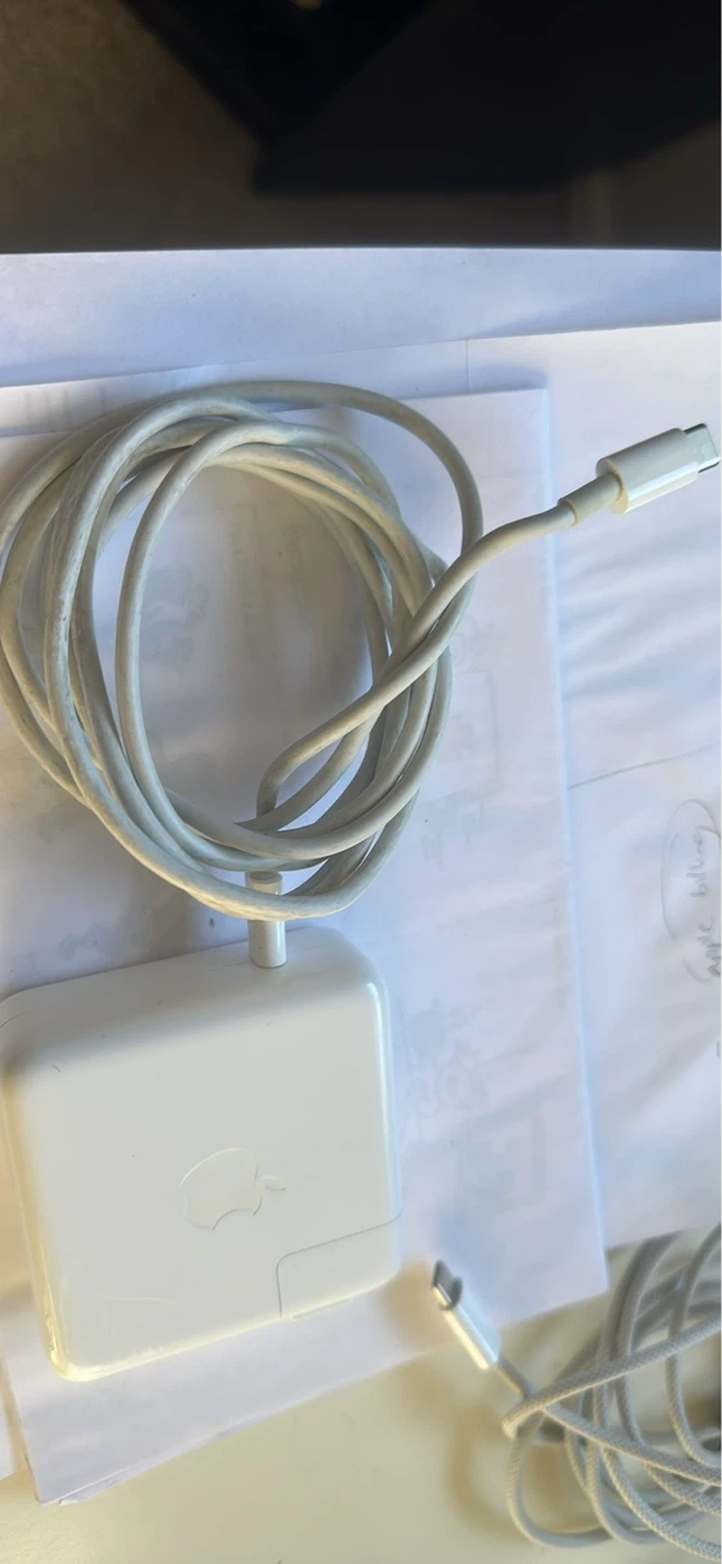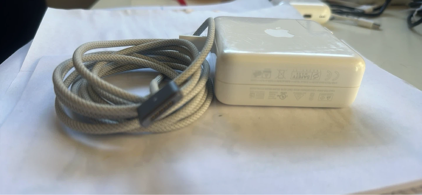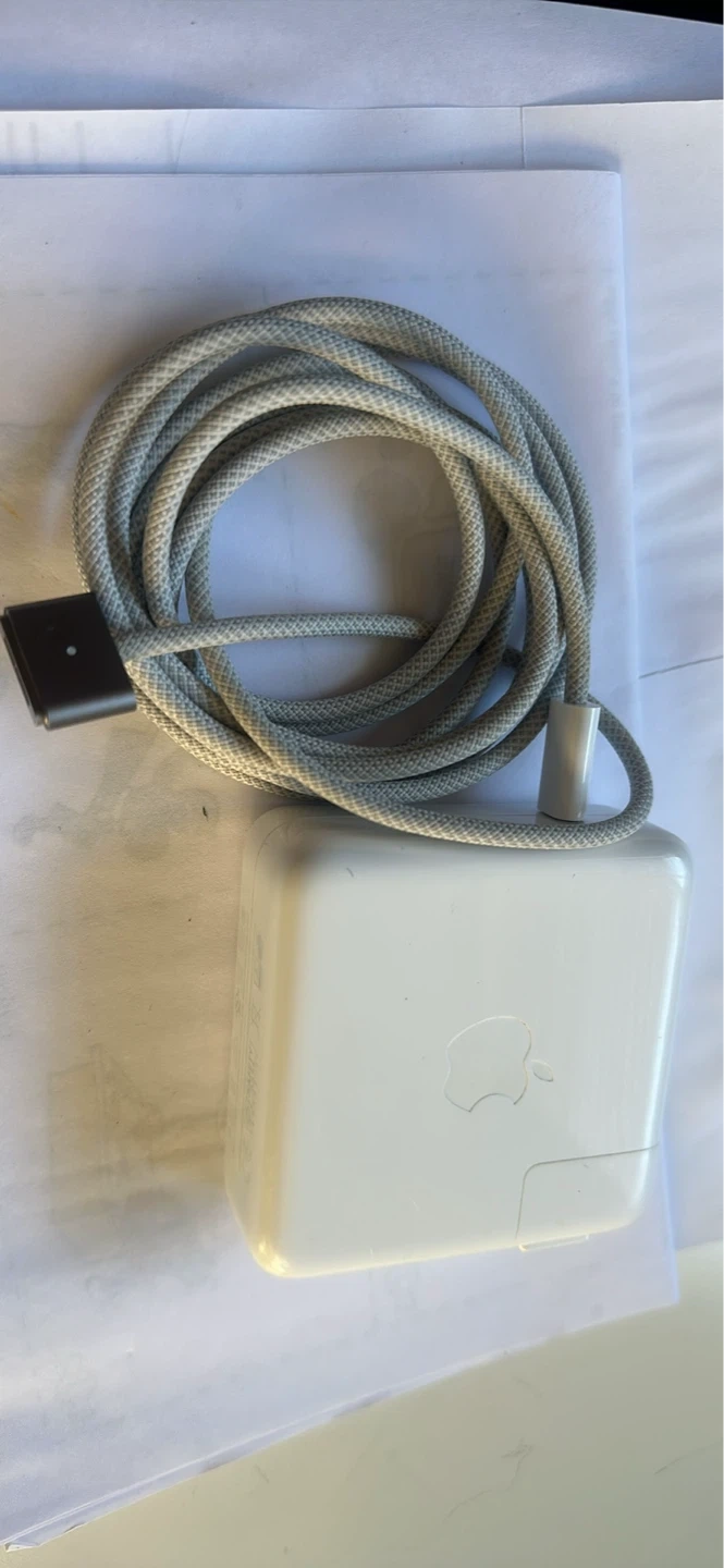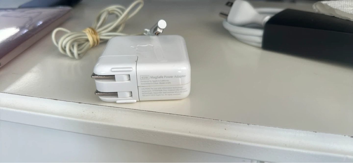 Apple 45W MagSafe Power Adapter. It's white and comes with a power cord. Great for charging your MacBook!