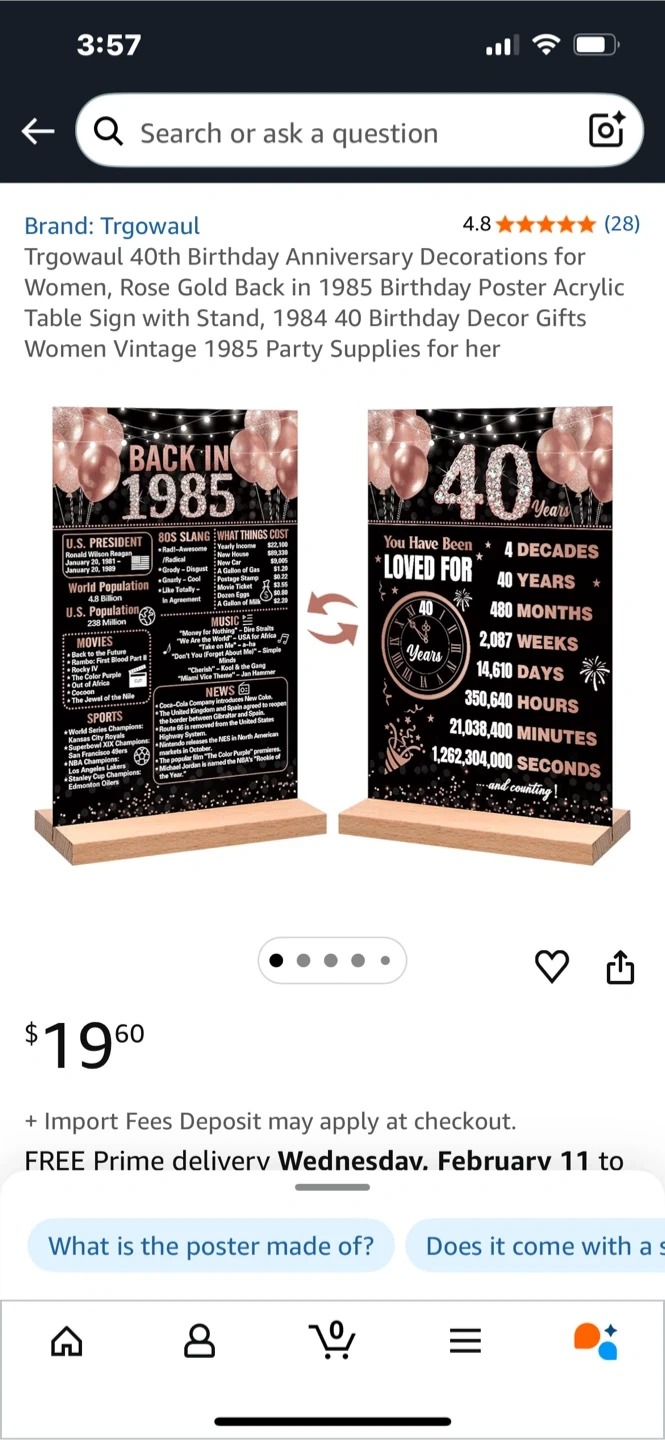 This rose gold 'Back in 1985' and '40 Years' poster set is a fun way to celebrate a milestone birthday. It features facts and trivia from 1985 on one side and a countdown of time in decades on the other. A wooden stand is included for display.