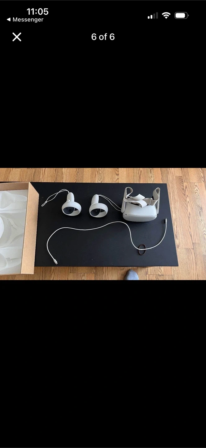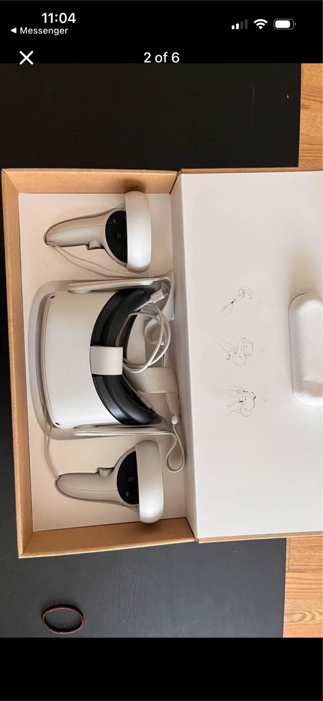 This is a Meta Quest 2 VR headset with controllers and a 128 GB storage capacity. It includes the headset, two controllers, and original packaging. This virtual reality system is great for gaming and immersive experiences.