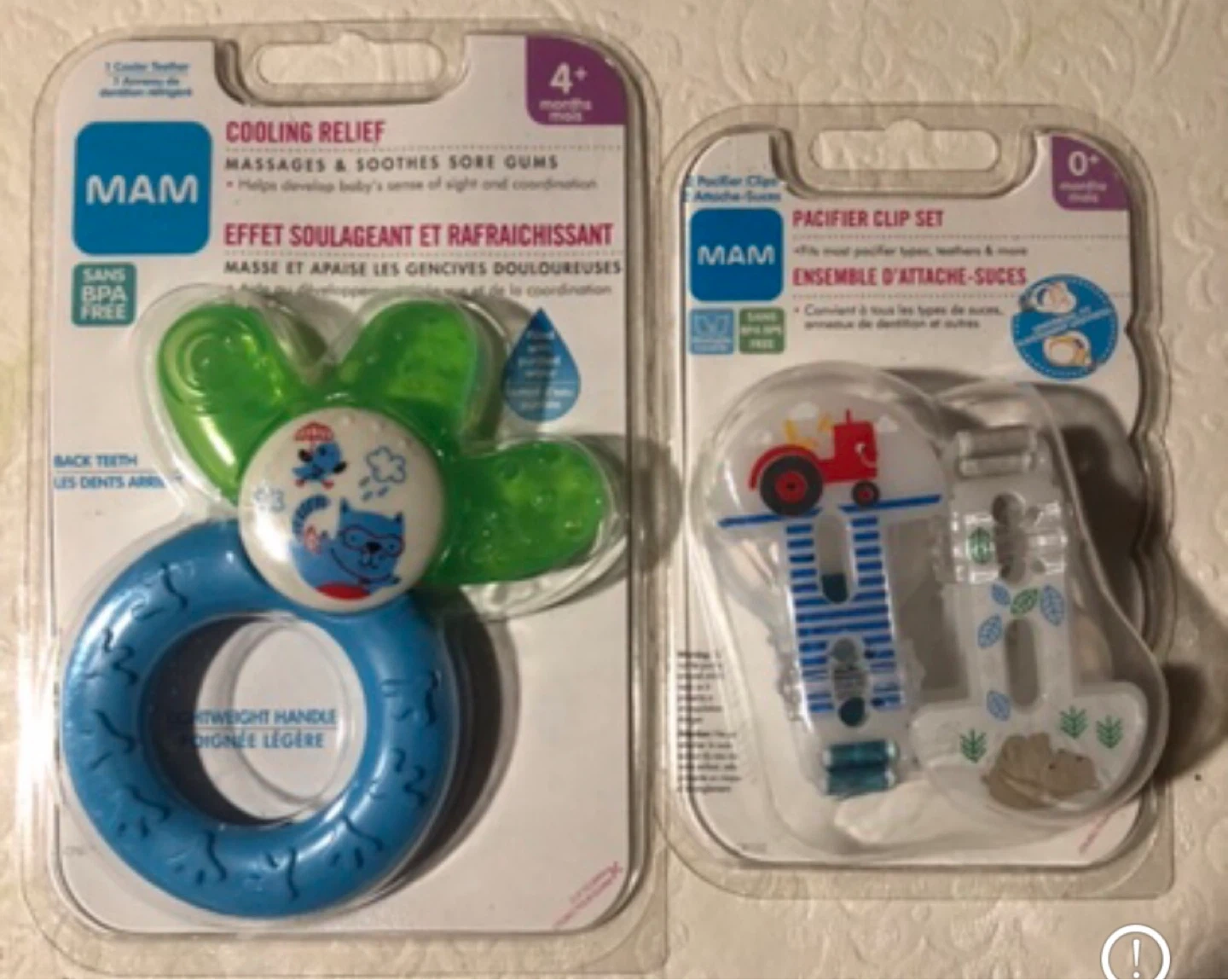 I'm selling a brand new MAM Cooling Relief Teether and Pacifier Clip Set. The teether is designed for babies 4+ months and provides cooling relief to massage and soothe sore gums. The pacifier clip set is suitable for newborns 0+ months and can attach to most pacifier types, teethers, and more. Both items are BPA-free and come in their original packaging
