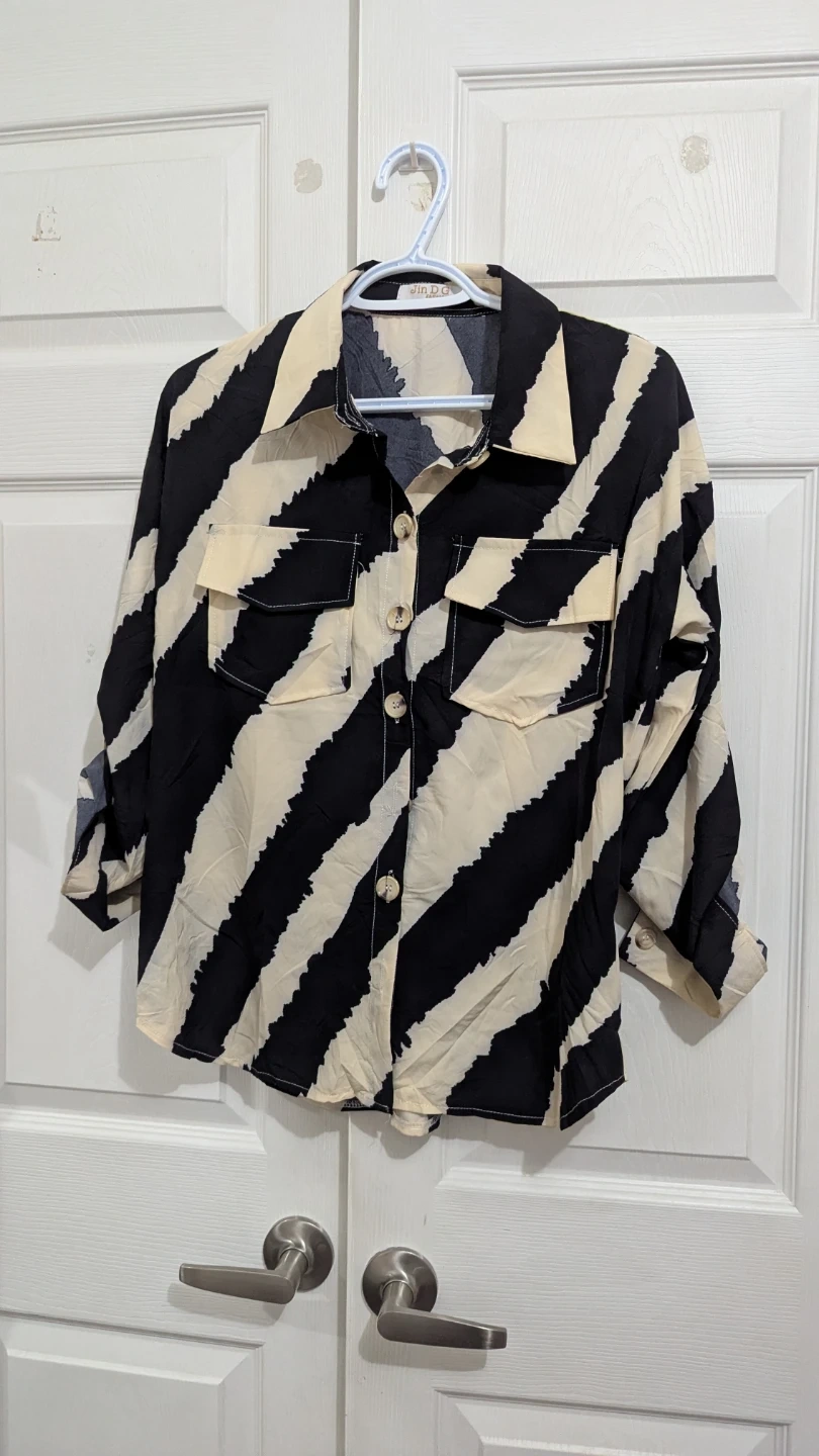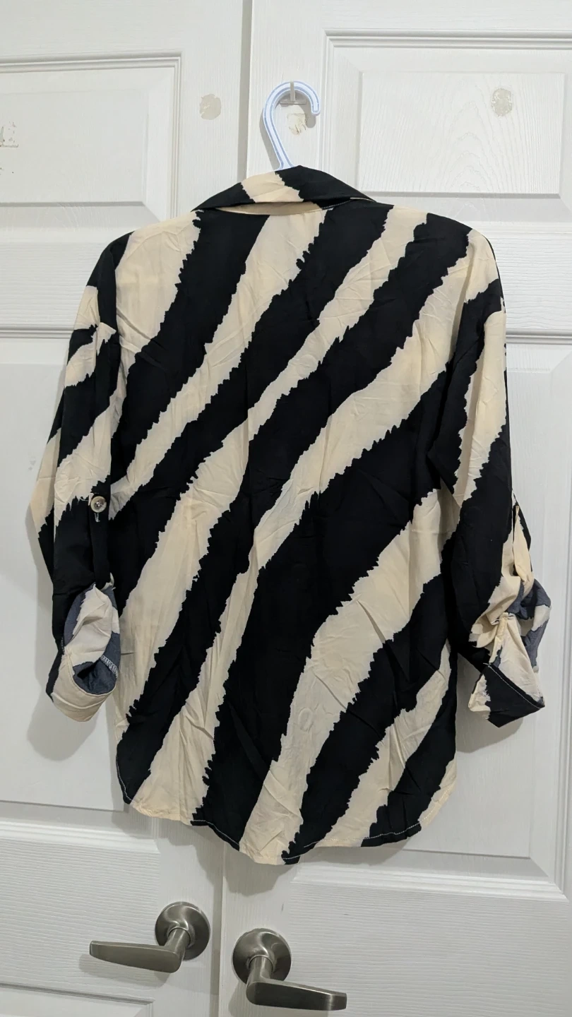 Here's a Winport blouse with a unique striped design! It's a size Medium and features a button-down style with two front pockets. The material feels lightweight and comfortable, perfect for casual wear.