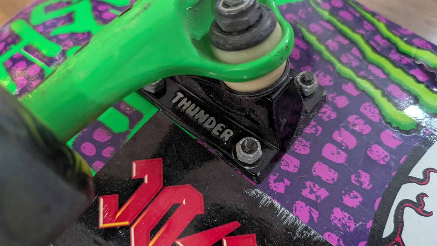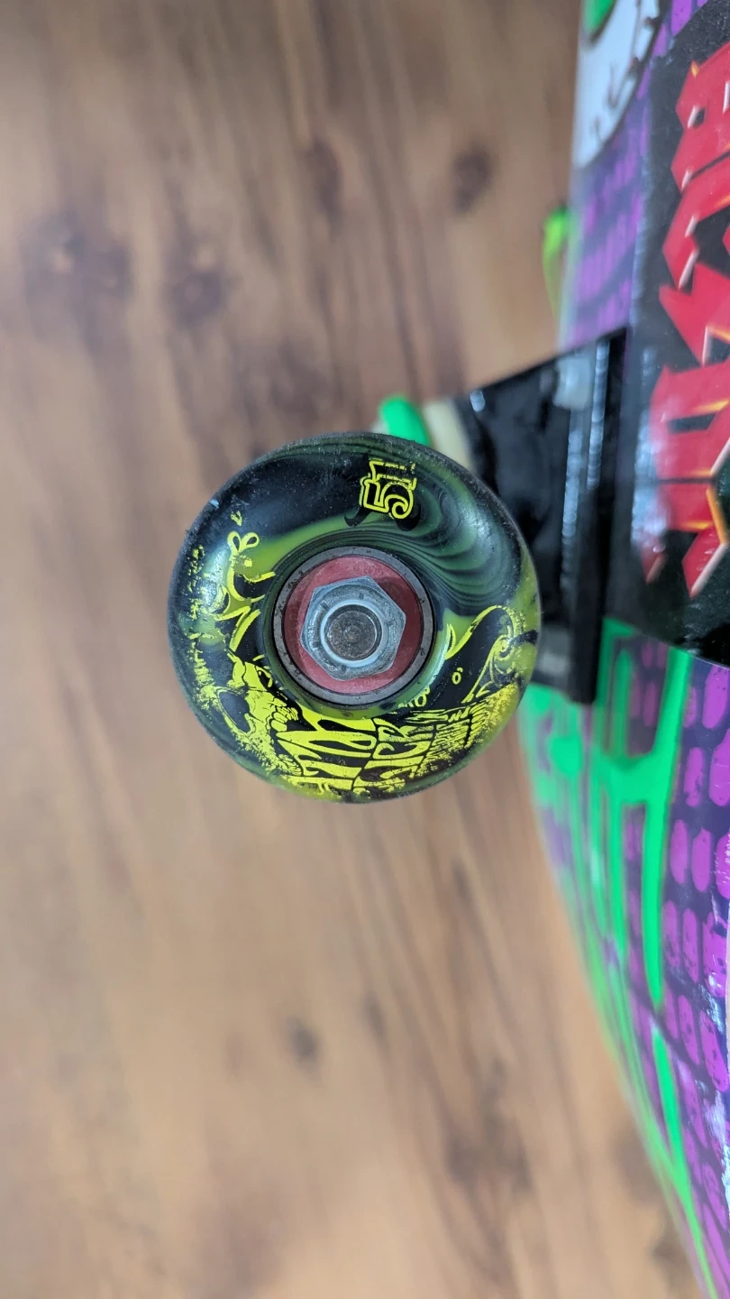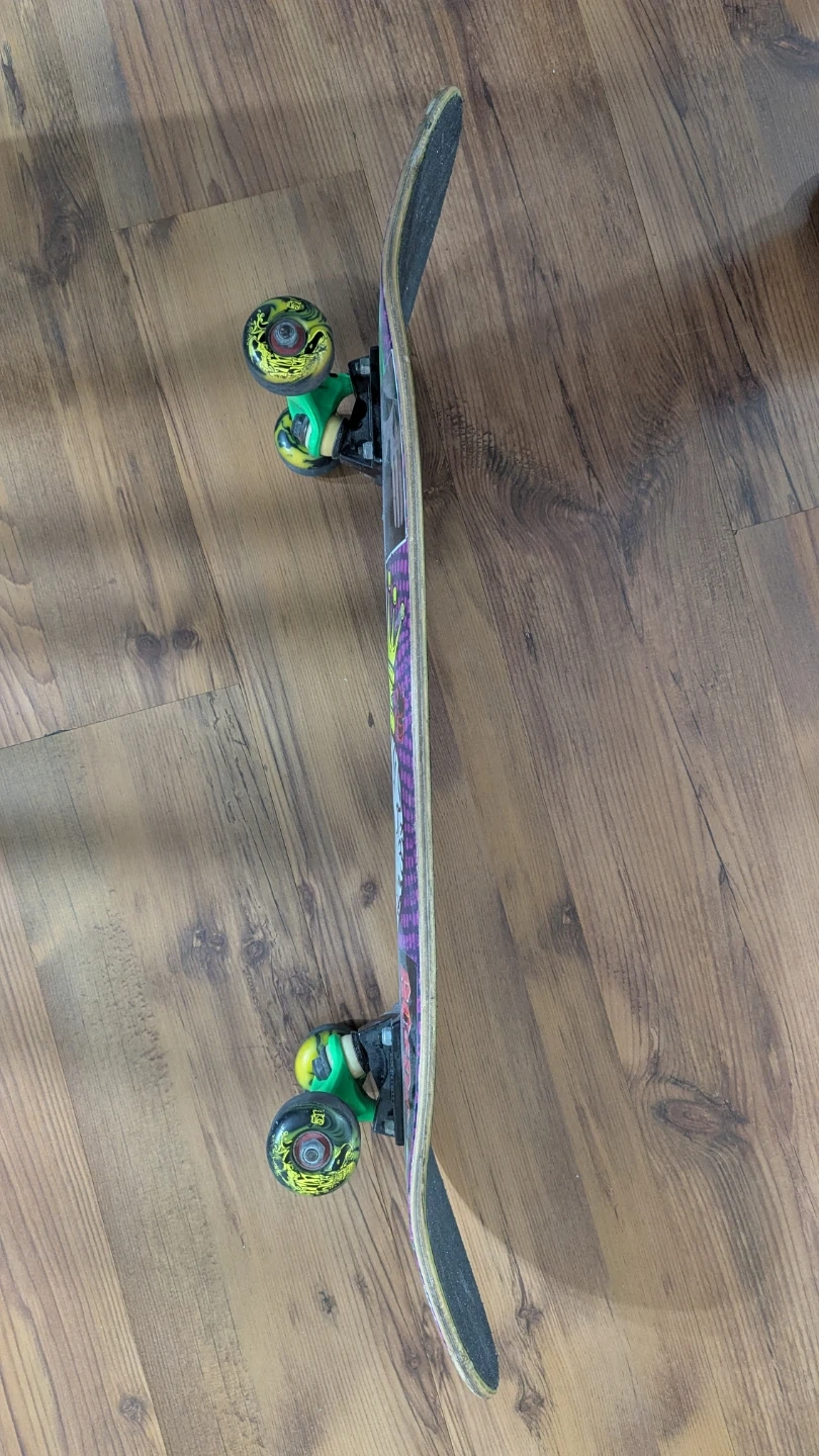 Selling a used *Rare Deck* Lizard King skateboard. It has green trucks and black wheels with yellow designs with Bones Reds bearings. Great for someone looking to get into skateboarding!