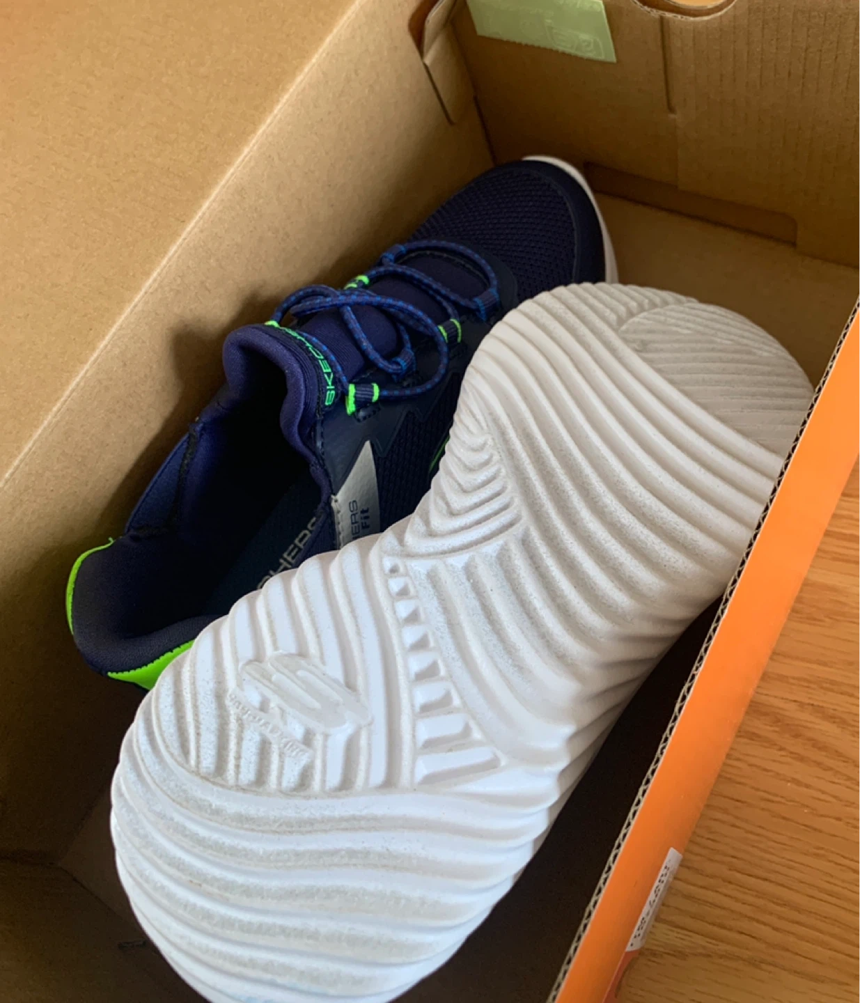These are Skechers kids running shoes in a size 13. They are a dark blue with neon green accents and feature adjustable straps. They're great for active kids on the go!