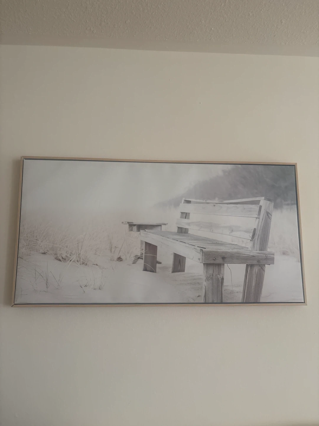This framed wall art depicts a rustic wooden bench in a serene, snowy landscape. It's a beautiful piece for adding a touch of nature and calm to any room. The art is presented in a simple, modern frame.