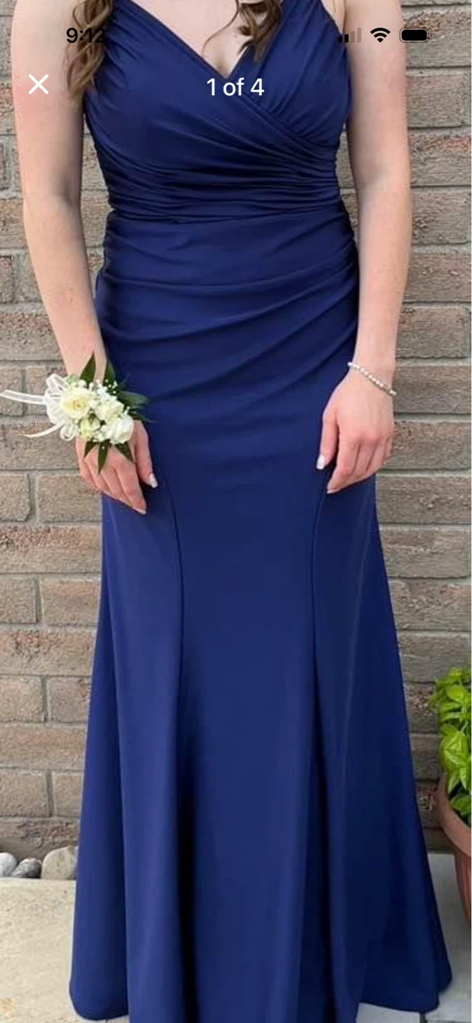 Stunning navy blue formal gown with a flattering ruched bodice and a mermaid-style skirt. It features delicate rhinestone straps for a touch of sparkle. This dress is perfect for a prom or special occasion!