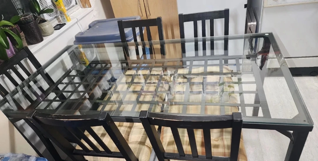 Selling a dining table with a glass top with metal frame legs and x6 wooden chairs with cushions.