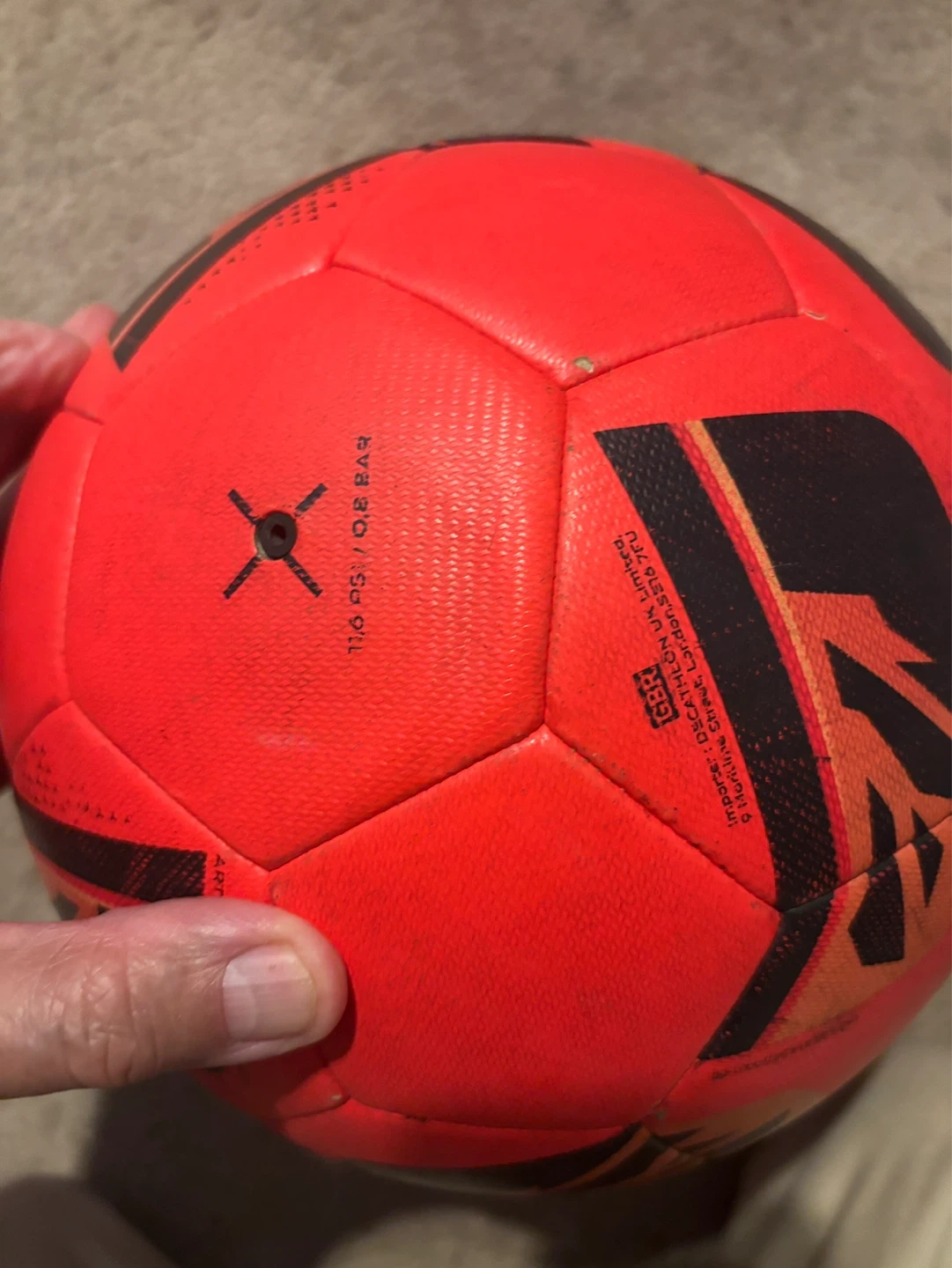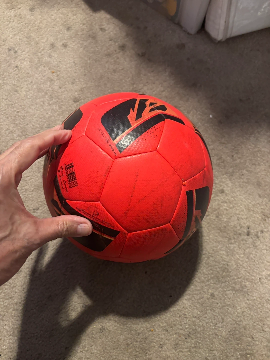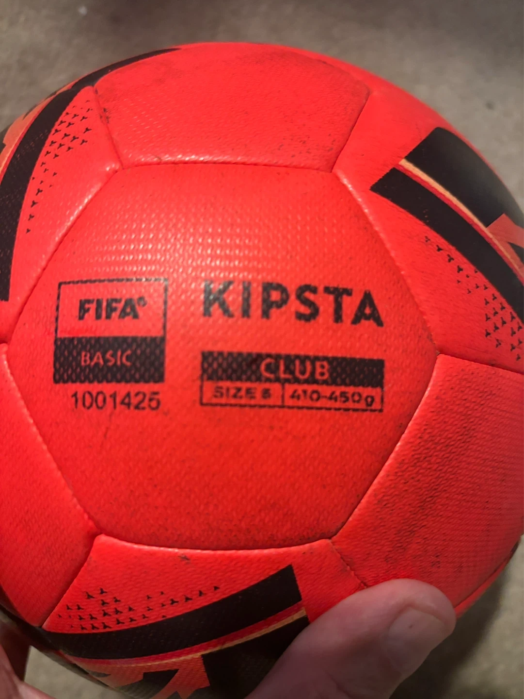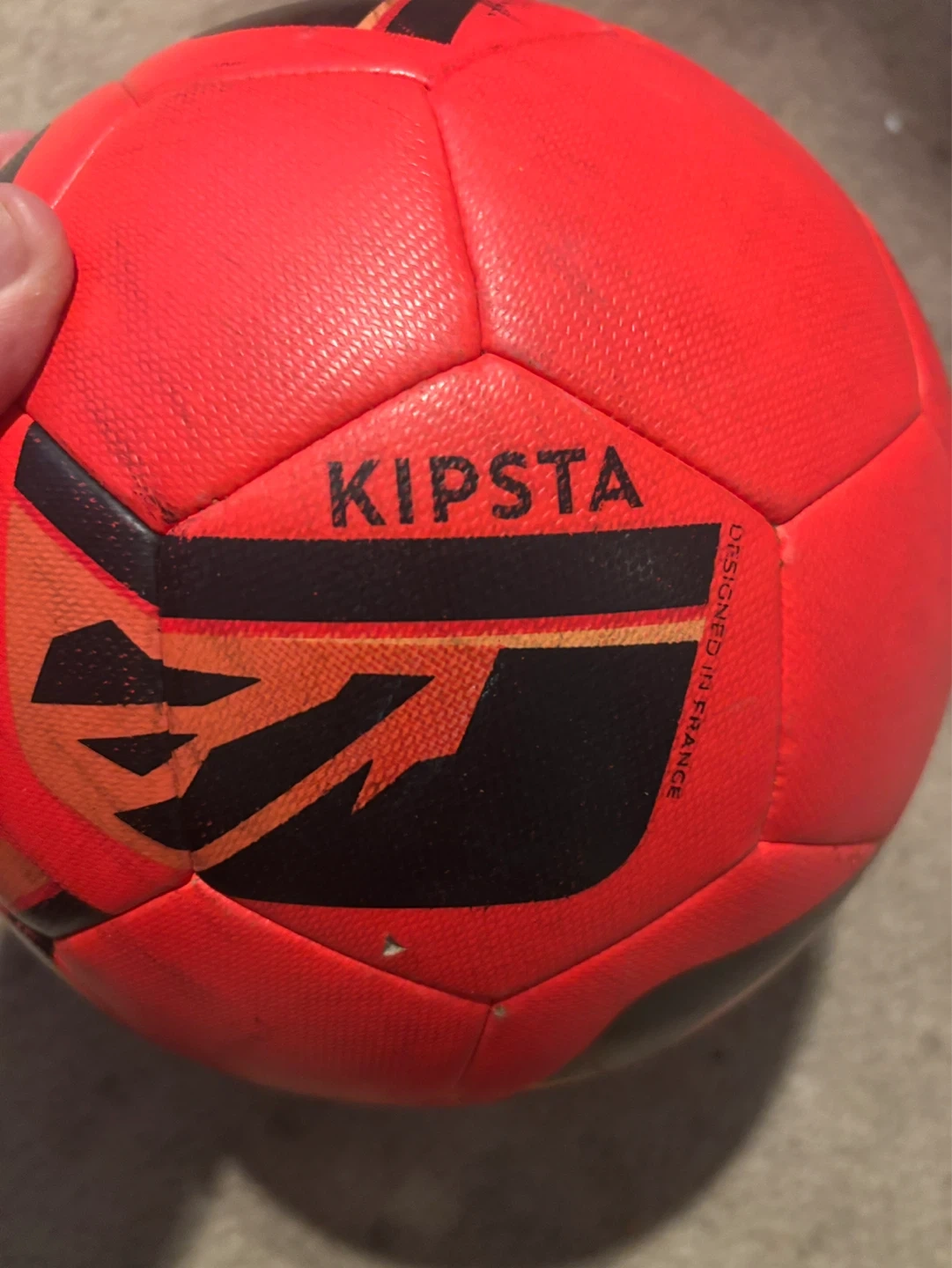 Bright orange Kipsta soccer ball. Designed in France. Size 5, weight 410-450g. Suitable for recreational play. For sale in Brampton near Fletchers Parkette.