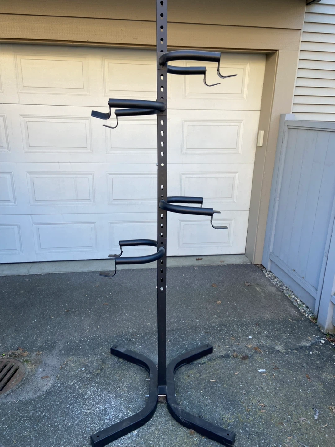 This is a black metal bike storage rack. It holds 4 bikes, adjustable heights for each rack. Can bolt to floor. It's a great way to save space in your garage or shed!
