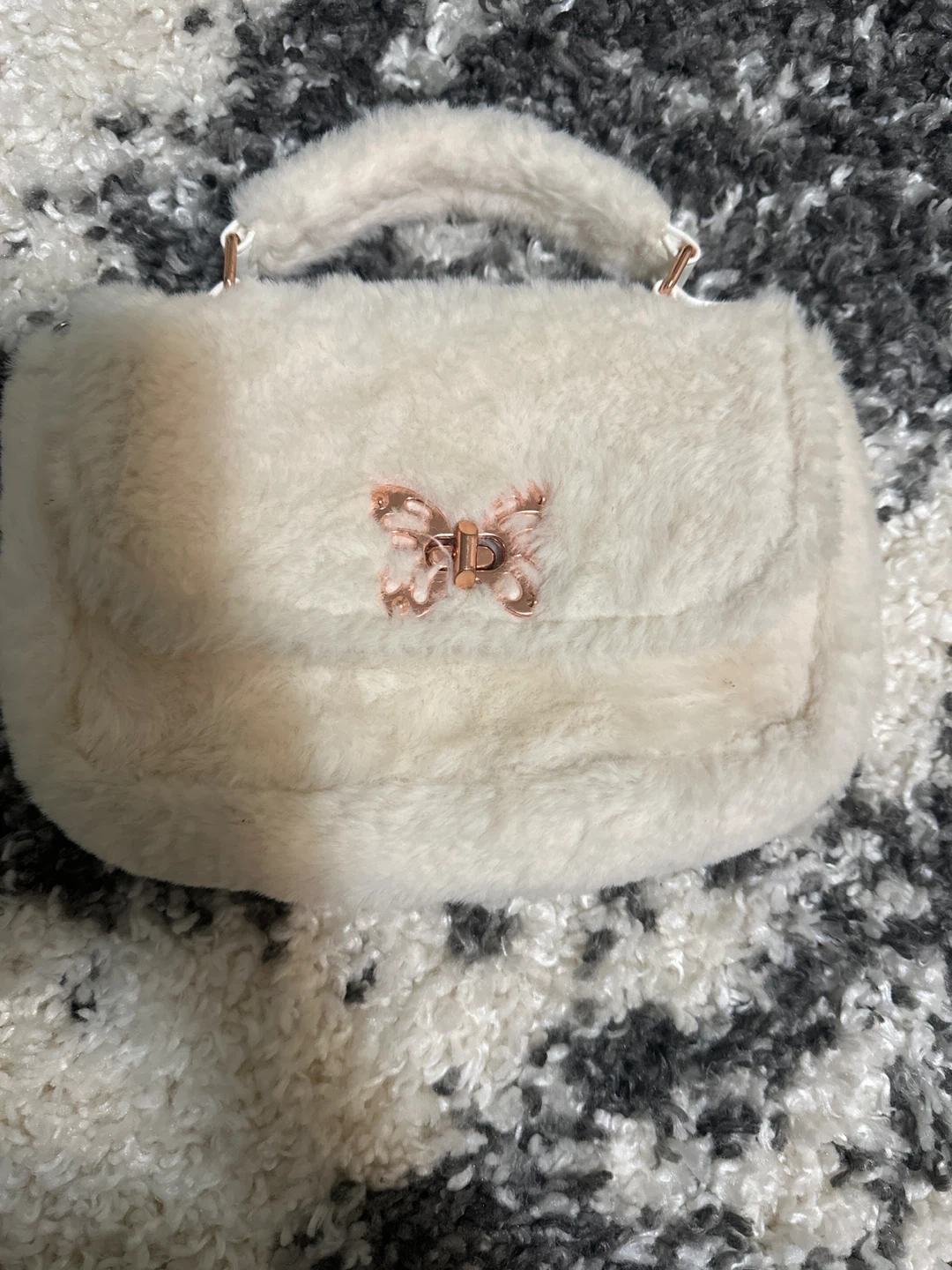 This cream fuzzy handbag features a rose gold butterfly clasp and chain strap. It's a cute accessory for nights out. Has a satin lining inside.