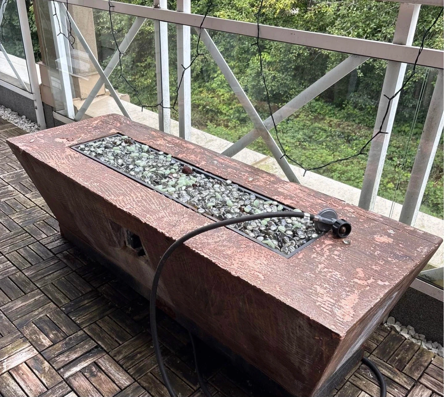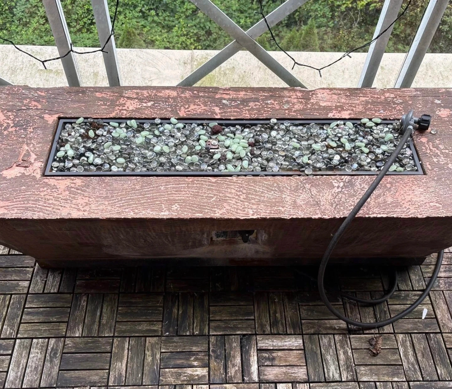 A rectangular gas fire pit featuring a concrete-like exterior and clear and green glass media. It includes a hose with a regulator attachment. This unit's rustic finish complements outdoor spaces.