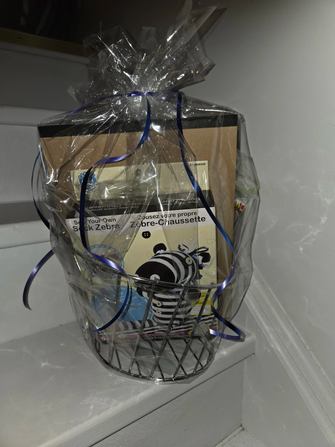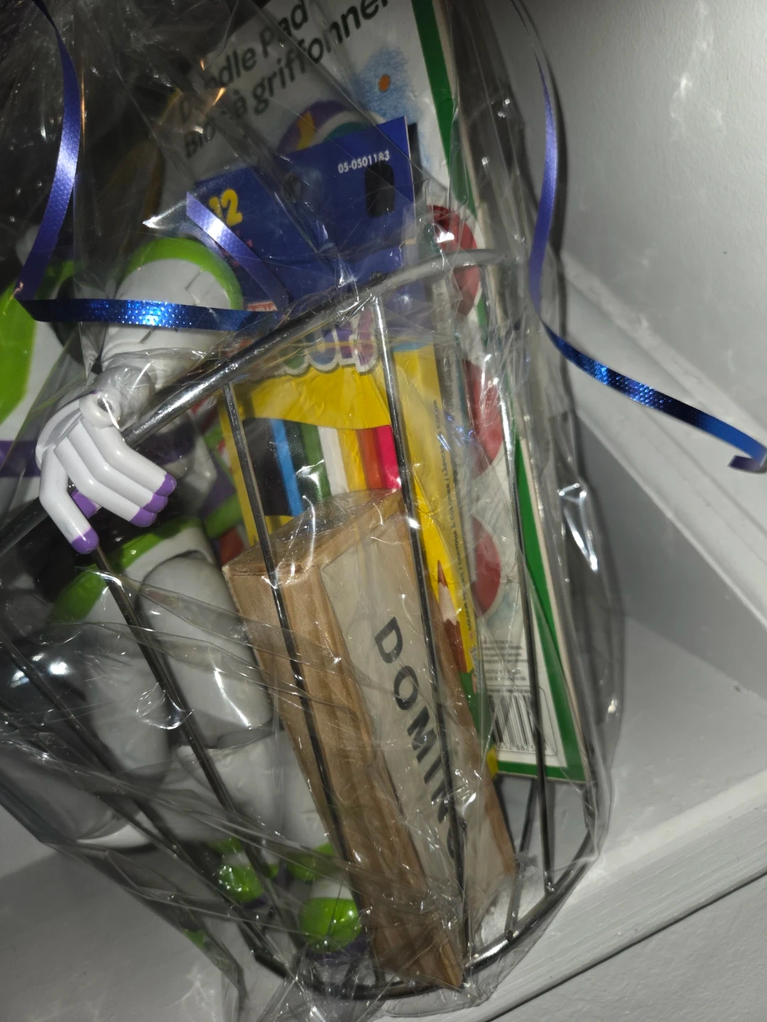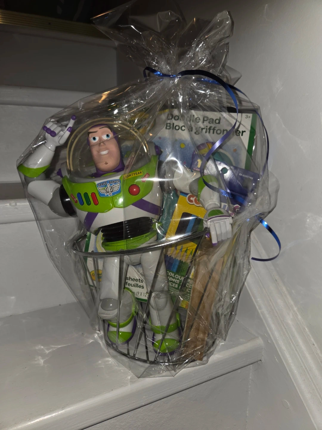 This gift basket features a Buzz Lightyear action figure along with a doodle pad, colouring pencils, and a craft kit. It's perfect for creative young fans of Toy Story!