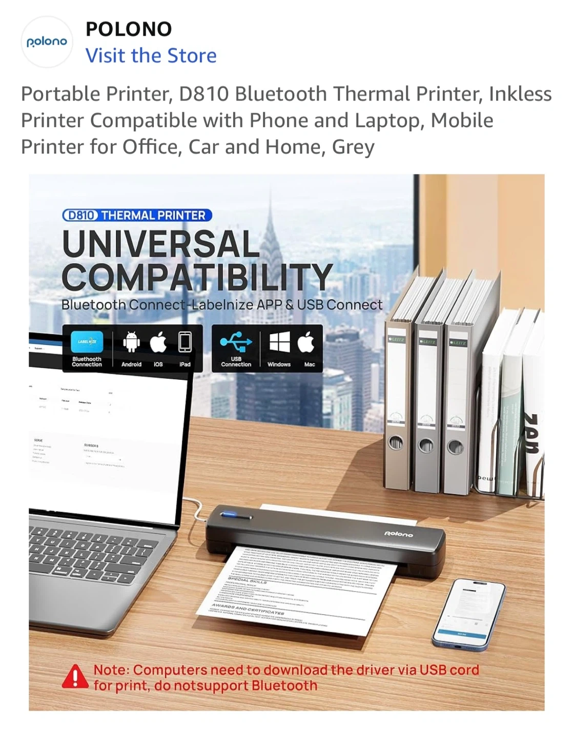 Looking to print on the go? This Polono D810 Bluetooth Thermal Printer is perfect for home, office, or even your car! It's an inkless printer that's compatible with phones and laptops. It supports various paper types, including roll paper, fan-fold paper, and tattoo transfer paper. Note that it requires a USB cord for printing and doesn't support Bluetooth printing.