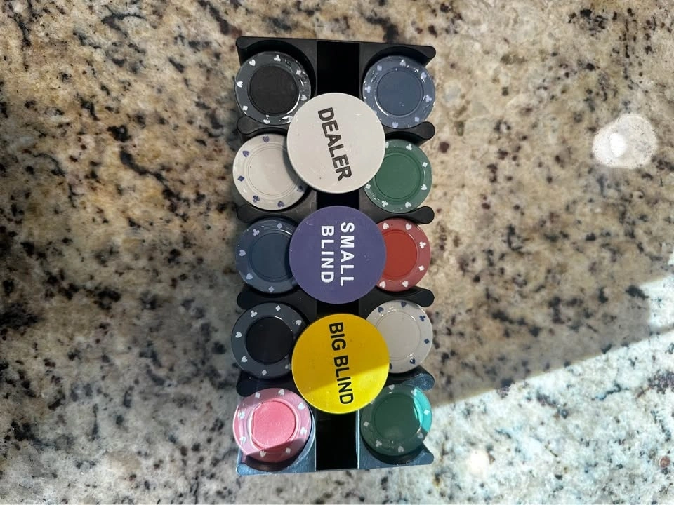 200 poker chips, new in packaging. Includes Big blind, small blind, and dealer chip. Comes in a metal case. No cards or mat included. Pickup only.