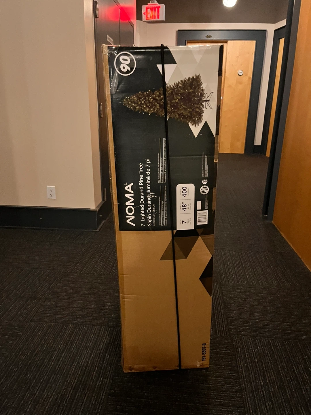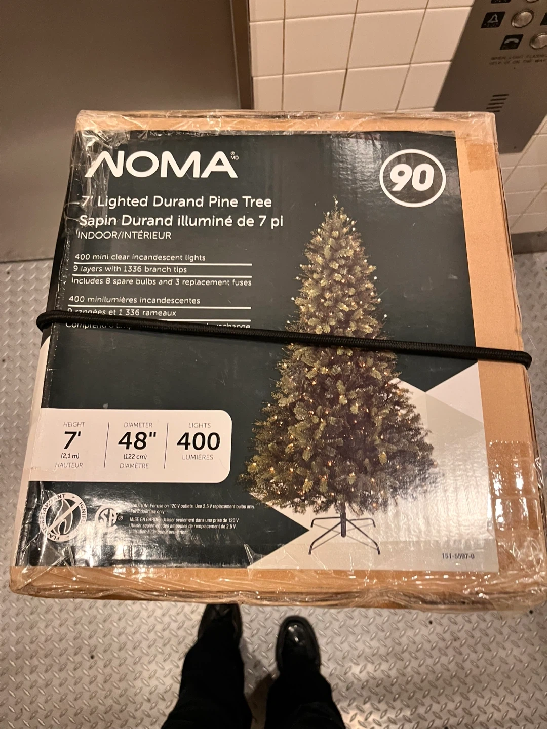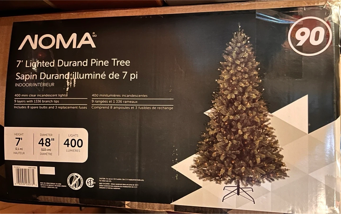 This is a NOMA 7' Lighted Durand Pine Tree. It has 400 mini clear incandescent lights and 1336 branch tips across 9 layers. Includes 8 spare bulbs and 3 replacement fuses.