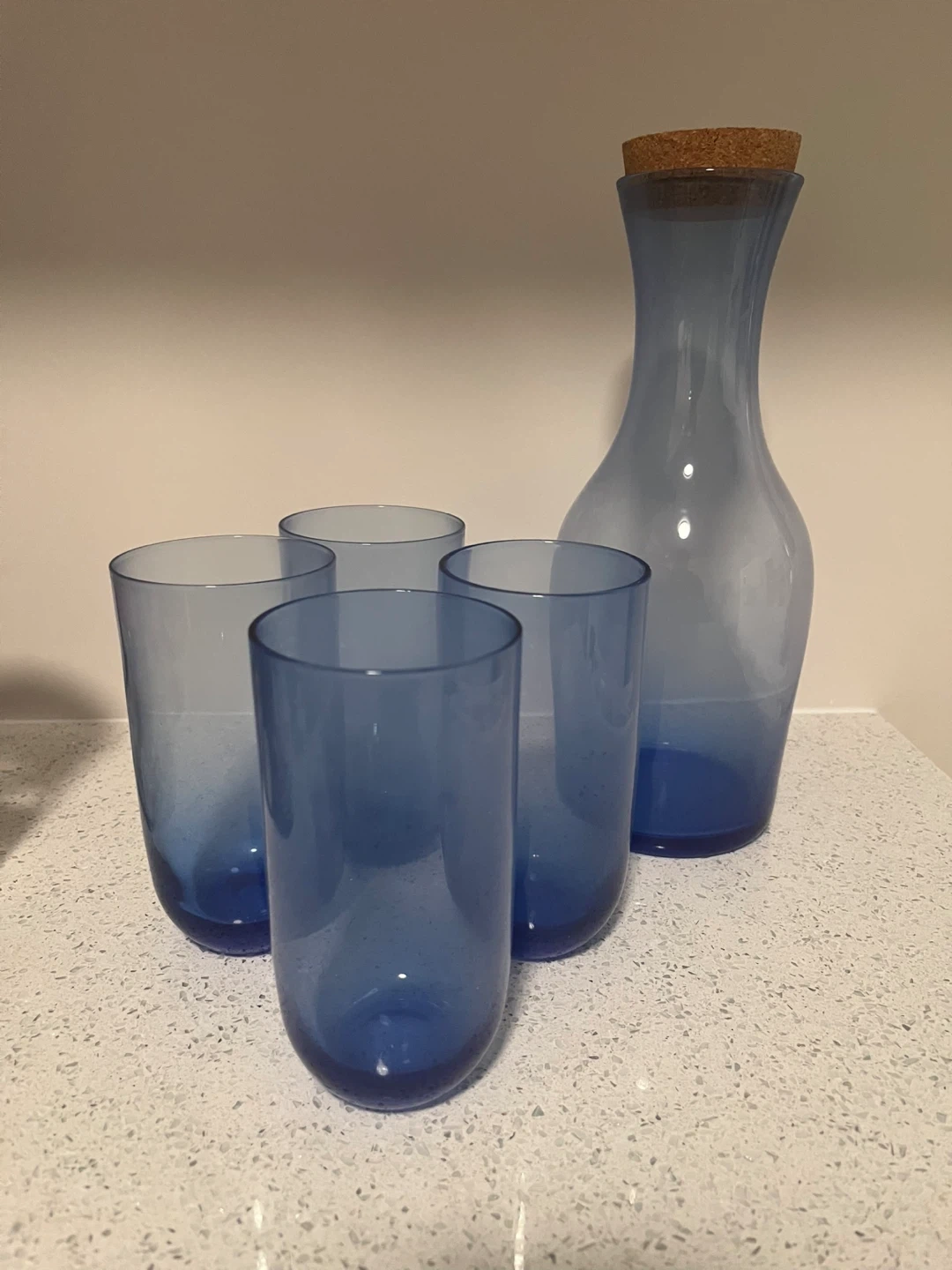 Set of four blue glass tumblers and a matching carafe with a cork stopper. Glassware is a translucent blue with a slight gradient. Tumblers are cylindrical with rounded bottoms. Carafe has a slender neck.