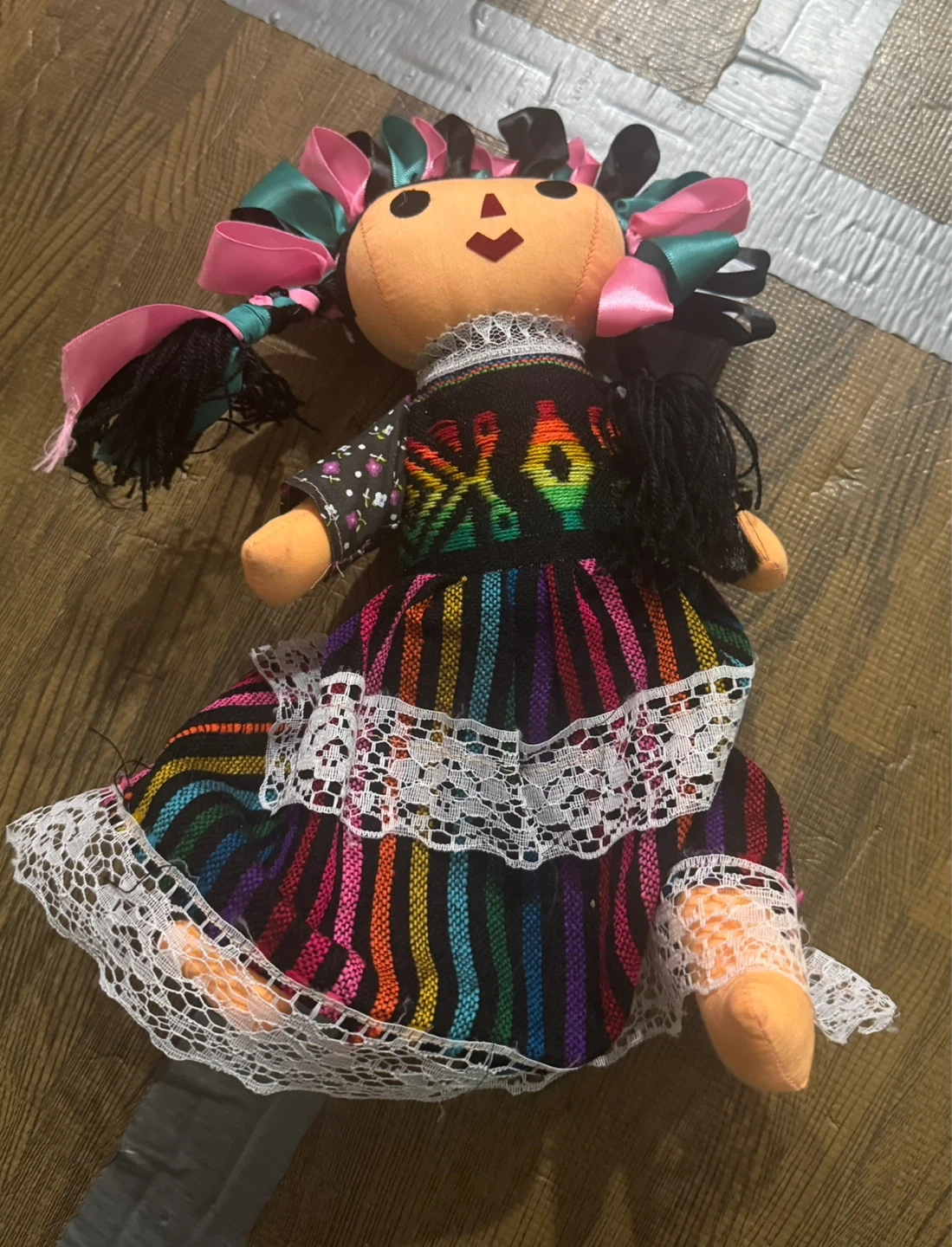 This is a handmade rag doll with vibrant, multi-coloured stripes and white lace trim. It's dressed in a traditional-style outfit with embroidered details. A fun decorative piece or toy!